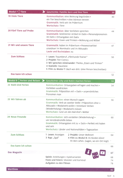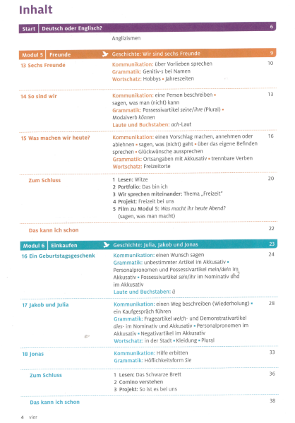 Vadovėlį sudaro keturi moduliai, kiekvieną modulį – 3 skyriai, kiekvienas jų užima 3-4 puslapius. Skyrių pavadinimai yra moksleivius įtraukiantys ir motyvuojantys, pvz. „Was machen wir heute?“, „Ein Geburtstagsgeschenk“, „Fünf Tiere auf Probe“, „Wir und unsere Tiere“, „Bald sind Ferien“ ir kt.