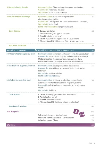 Kiekvieno modulio pabaigoje esančiame baigiamajame skyriuje pateikiami tekstai, krašto pažinimo informacija, projektinis darbas, kalbinės raiškos priemonės ir mokymosi metodai, taip pat modulio filmas. Baigiamasis skyriaus puslapis „Das kann ich schon“ yra skirtas refleksijai.