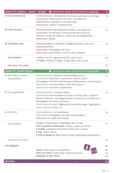 Vadovėlį sudaro keturi moduliai, kiekvieną modulį – 3 skyriai, kiekvienas jų užima 3–4 puslapius. Skyrių pavadinimai yra moksleivius įtraukiantys ir motyvuojantys, pvz. „Die Party-Vorbereitung“, „Essen ist gesund?“, „Körperschmuck“, „Computer usw.“, „Im Jugendhotel“, „In Berlin“ ir kt.