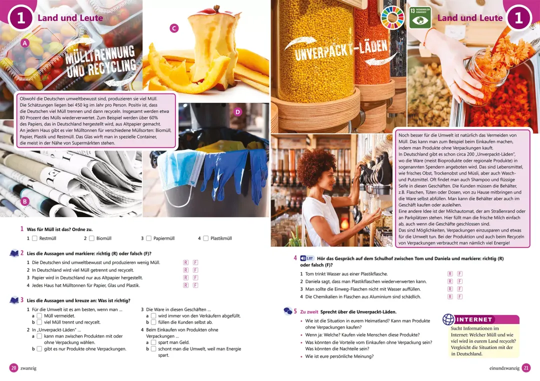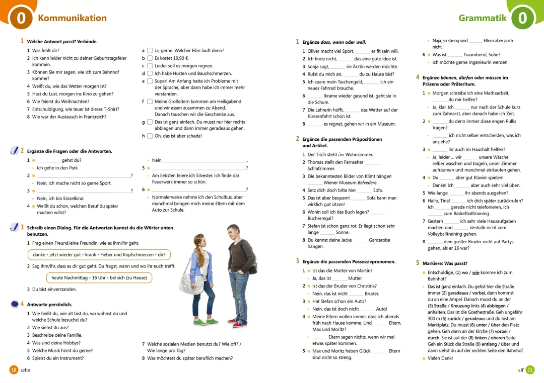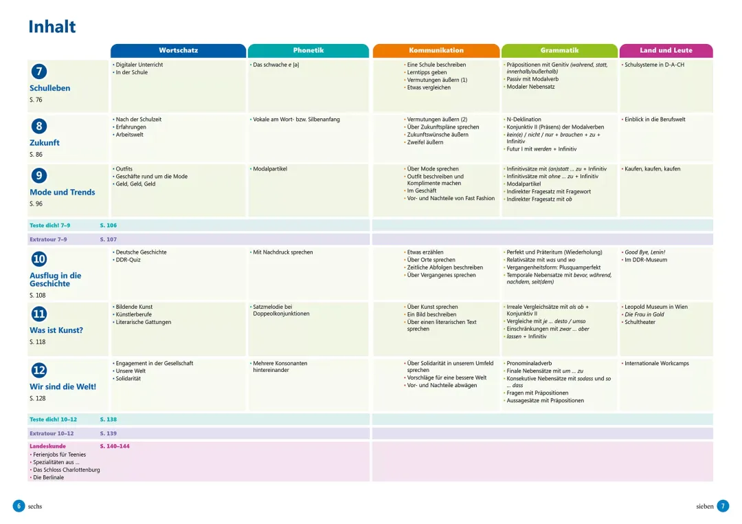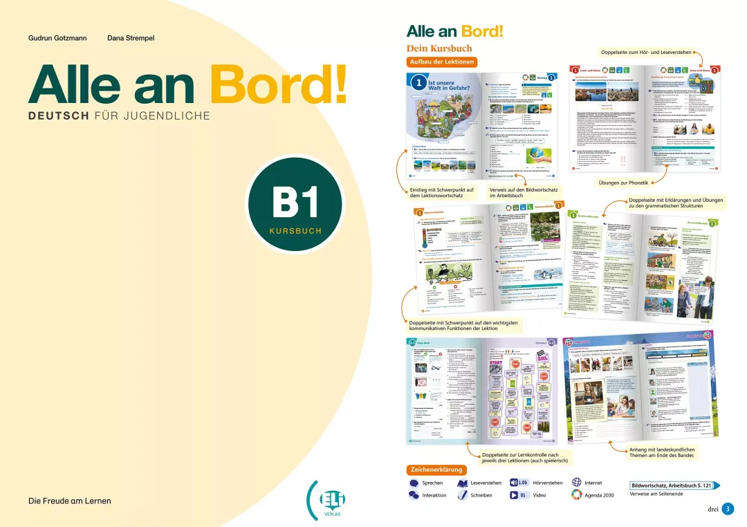 - Mokinio knyga: įvadinė pamoka ir 12 pamokų po 10 puslapių, kurie susideda iš užduočių, pristatančių temos žodyną bei dialogų tarp penkių knygos veikėjų. Naudodami klausymo ir skaitymo supratimo užduotis bei atlikdami fonetikos užduotis mokiniai dalyvauja bendraamžių kasdienybėje ir patiria kartu su jais nuotykius. Užduotys su specifinėmis komunikacinėmis funkcijomis ir struktūromis, su gramatikos taisyklėmis, skirtomis produkavimui ir klausymo supratimui. Gramatikos užduotys turi kontekstą ir komunikacinį aspektą. Užduotys, supažindinančios su kraštotyra, skirtos klausymo bei skaitymo supratimui. Po kiekvienų trijų temų tikrinami įgūdžiai pagal temą, naudojant kartojimo užduotis ar vaidmenų žaidimą. Knygos pabaigoje – vokiškai kalbančių šalių kultūros skyrius.