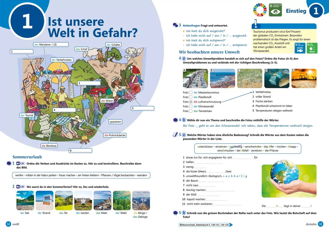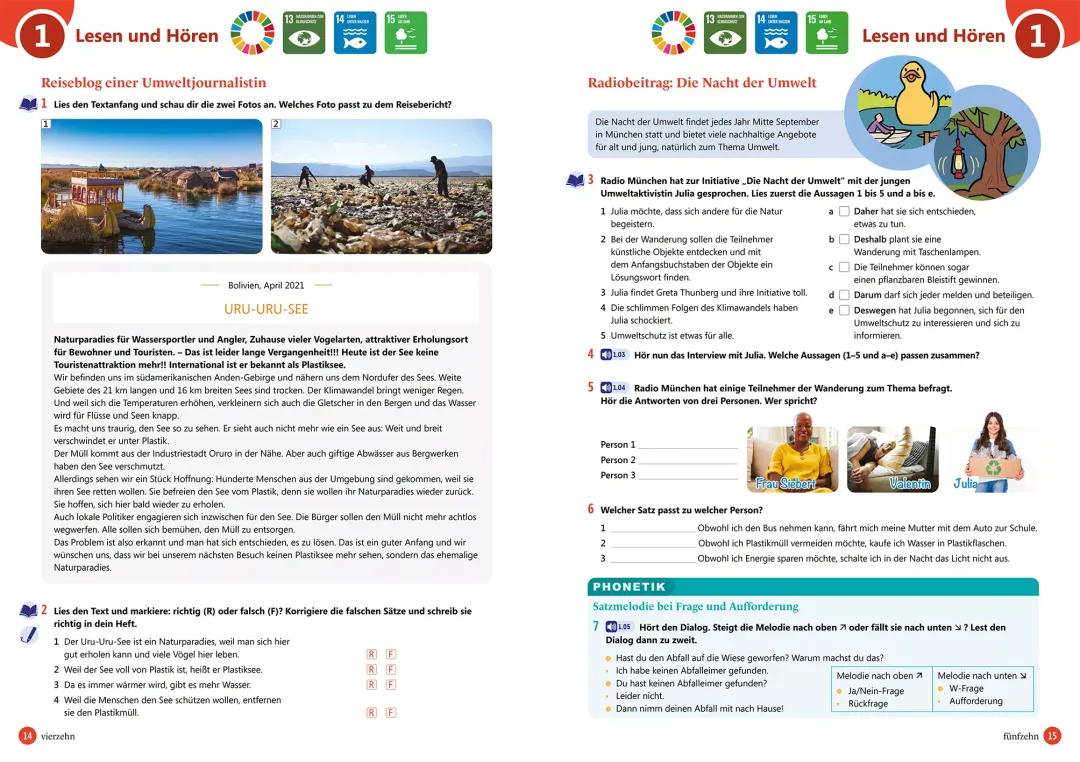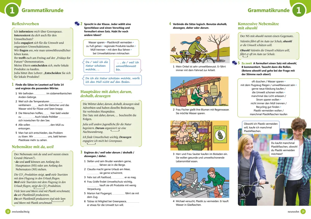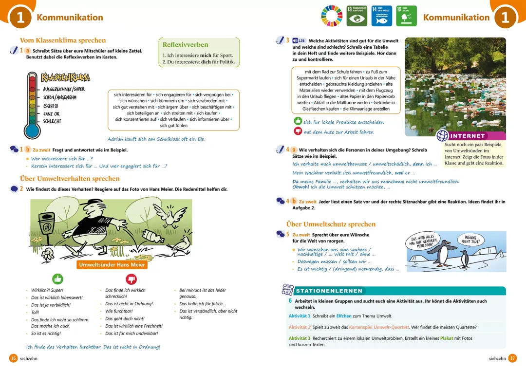 - Mokinio knyga: įvadinė pamoka ir 12 pamokų po 10 puslapių, kurie susideda iš užduočių, pristatančių temos žodyną bei dialogų tarp penkių knygos veikėjų. Naudodami klausymo ir skaitymo supratimo užduotis bei atlikdami fonetikos užduotis mokiniai dalyvauja bendraamžių kasdienybėje ir patiria kartu su jais nuotykius. Užduotys su specifinėmis komunikacinėmis funkcijomis ir struktūromis, su gramatikos taisyklėmis, skirtomis produkavimui ir klausymo supratimui. Gramatikos užduotys turi kontekstą ir komunikacinį aspektą. Užduotys, supažindinančios su kraštotyra, skirtos klausymo bei skaitymo supratimui. Po kiekvienų trijų temų tikrinami įgūdžiai pagal temą, naudojant kartojimo užduotis ar vaidmenų žaidimą. Knygos pabaigoje – vokiškai kalbančių šalių kultūros skyrius.