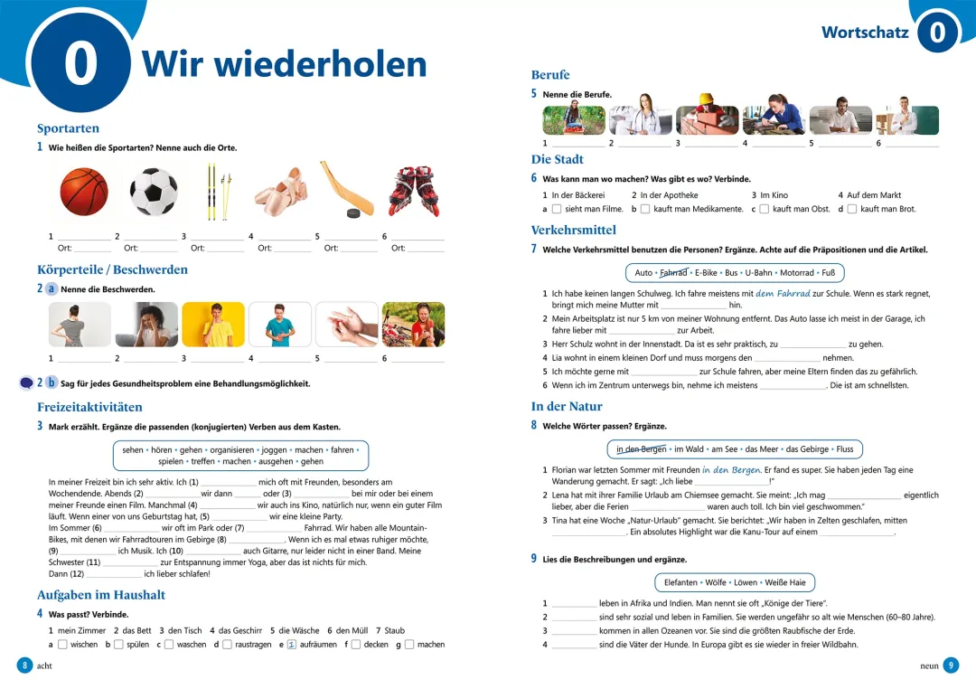- Pratybų knyga: pratybų knygos temos susietos su vadovėlio medžiaga, užduotys padeda sustiprinti klausymo ir skaitymo supratimą, įtvirtinti pamokos žodyną, aktualizuoti pateiktą kalbinę ir gramatikos medžiagą, sudaro sąlygas įvairiai kalbinei veiklai, numato priėmimą, gamybą, sąveiką ir tarpininkavimą. Savęs vertinimo veiklų metu mokiniai įsitikina, ar jų žinios pasiekė „Bronzą“, „Sidabrą“ ar „Auksą“. Užduotys po kiekvienų trijų temų skirtos pasirengti „FIT in Deutsch“ egzaminams. Prieduose yra iliustruoti žodynai su pratimais, taip pat idiomų rinkinys ir apžvalginiai žemėlapiai.