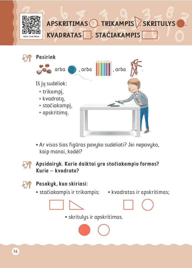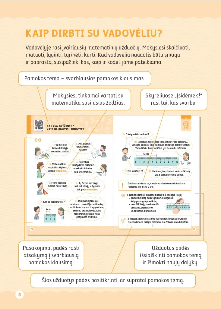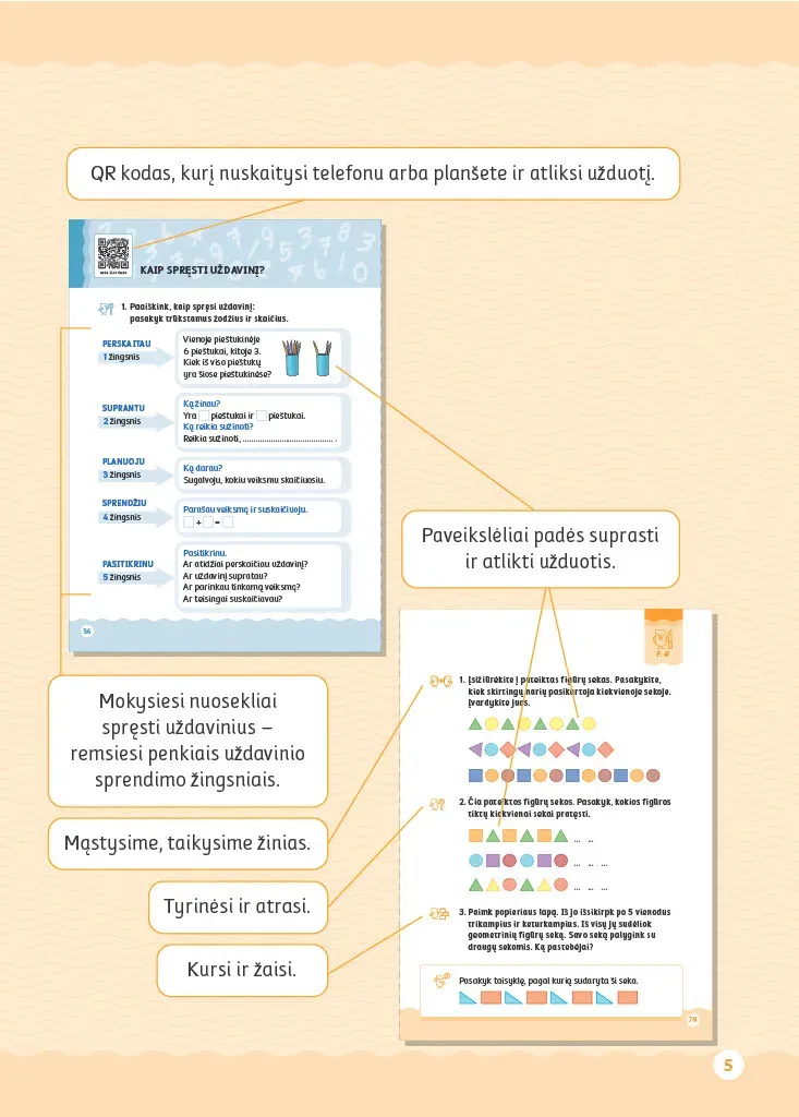 - pagalbą (paaiškinimų tekstu, ženklais, schemomis; klausimų), kuri padės mokytis tiek bendradarbiaujant su klasės draugais, tiek ir dirbant individualiai;