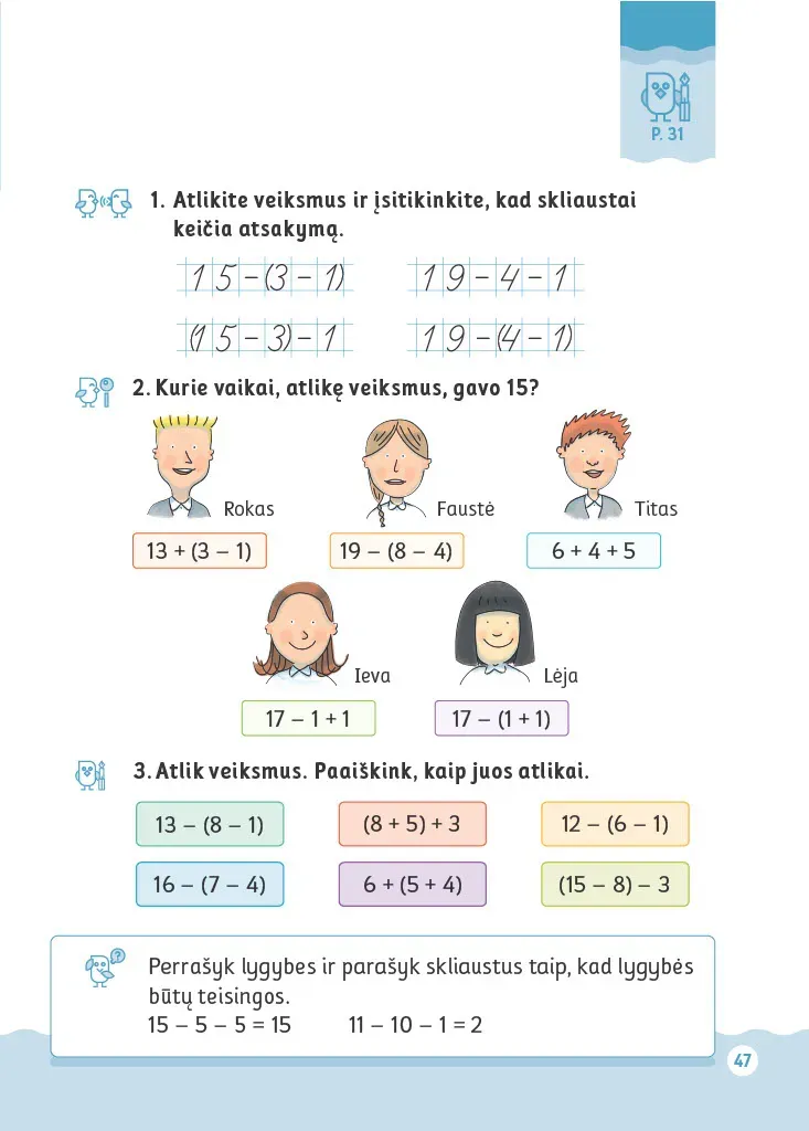 - pagalbą (paaiškinimų tekstu, ženklais, schemomis; klausimų), kuri padės mokytis tiek bendradarbiaujant su klasės draugais, tiek ir dirbant individualiai;