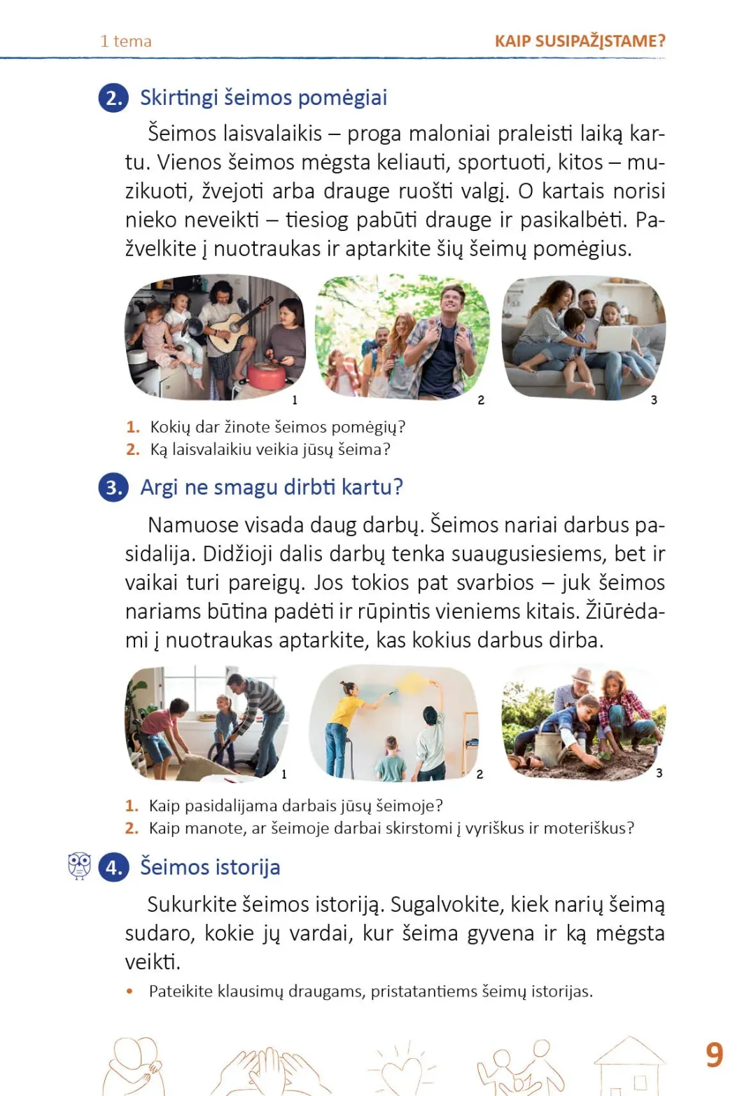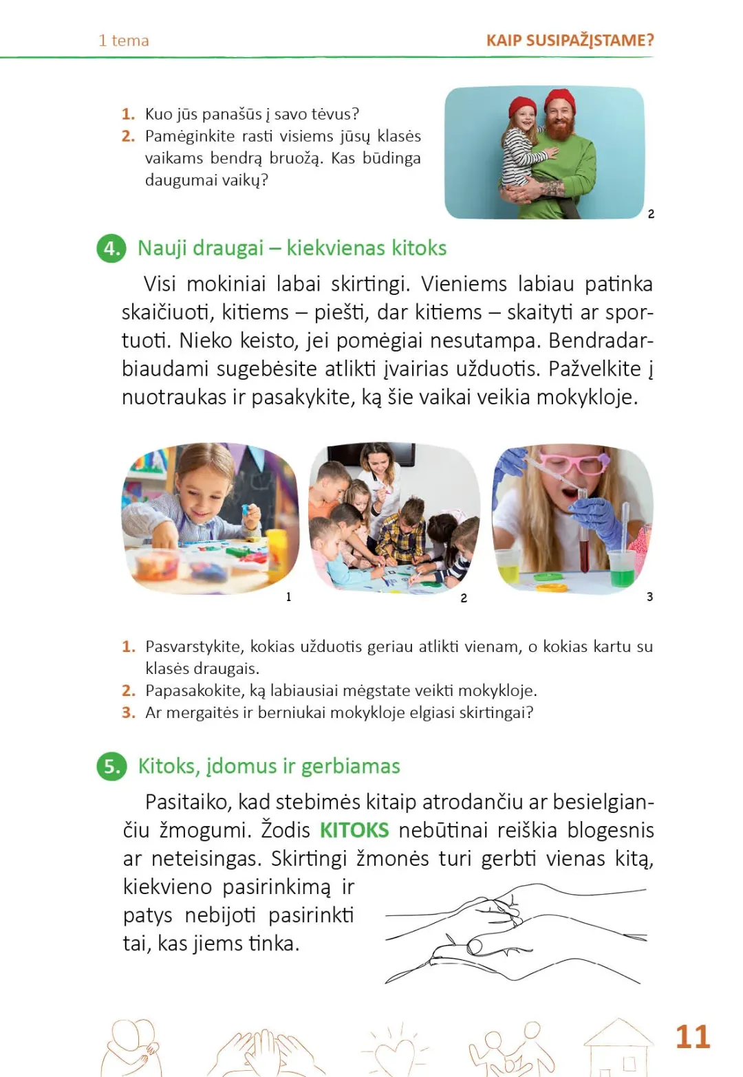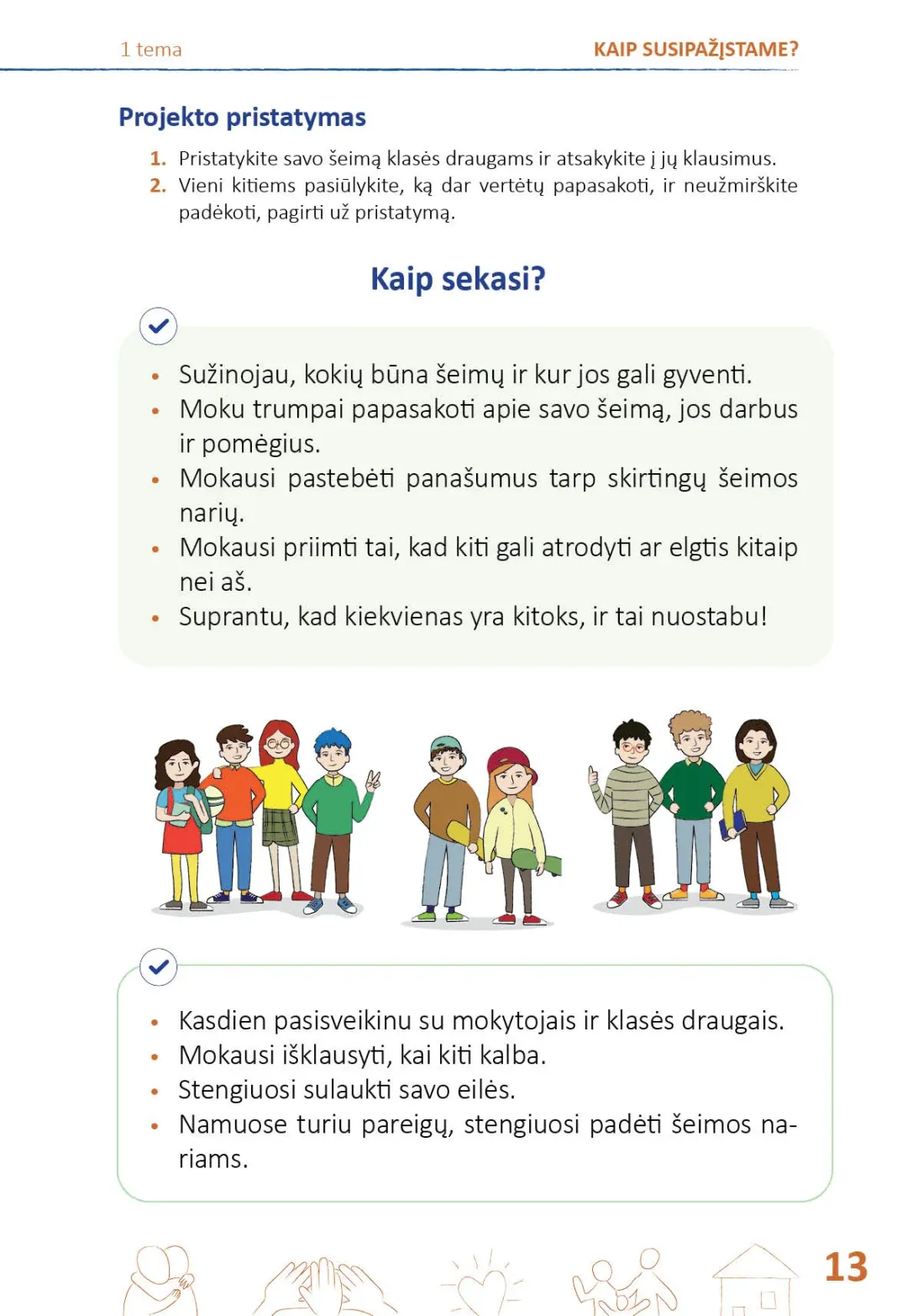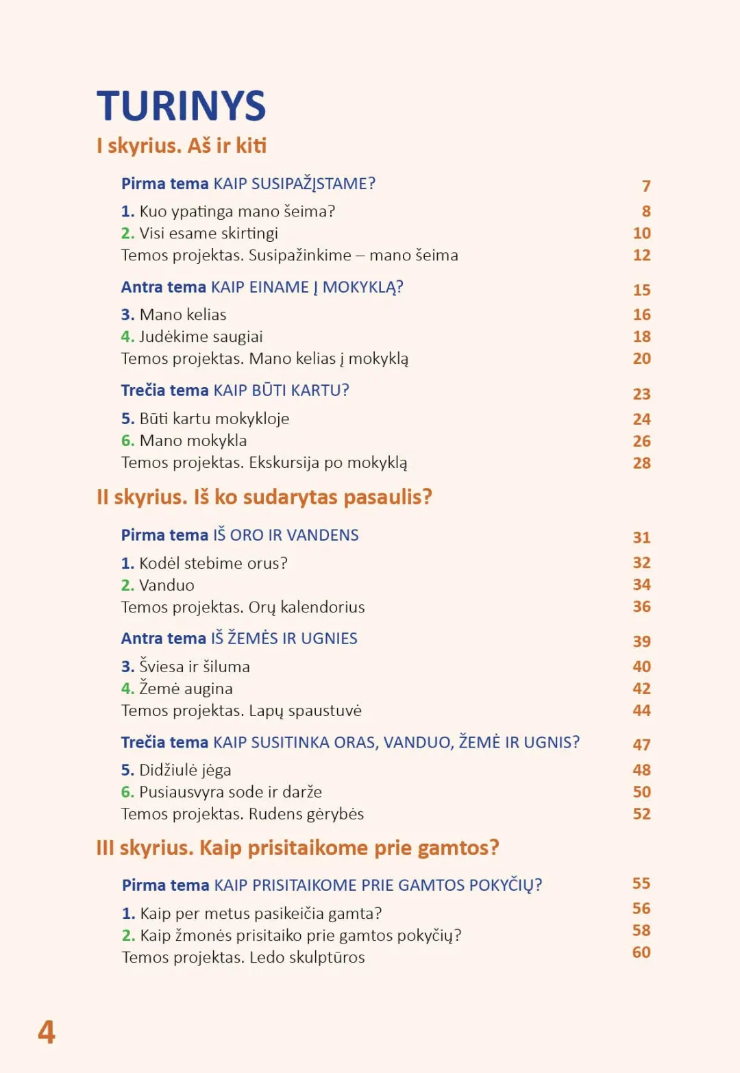 Kiekviena tema prasideda pristatymu: iliustracijomis, klausimais, raktiniais temos žodžiais. Temos nagrinėjamos visuomeninio ugdymo ir gamtos mokslų pamokose, kurios vadovėlyje išdėstytos tolygiai numatytam laikotarpiui. Pritaikyti įgytas žinias ir įtvirtinti gebėjimus padeda kiekvieną temą vainikuojanti projektinė veikla. Iš viso pirmoje vadovėlio dalyje pateikta 15 projektų.