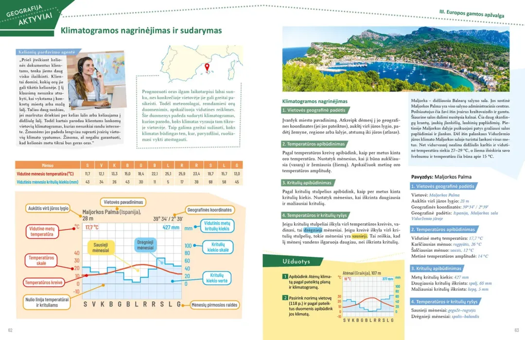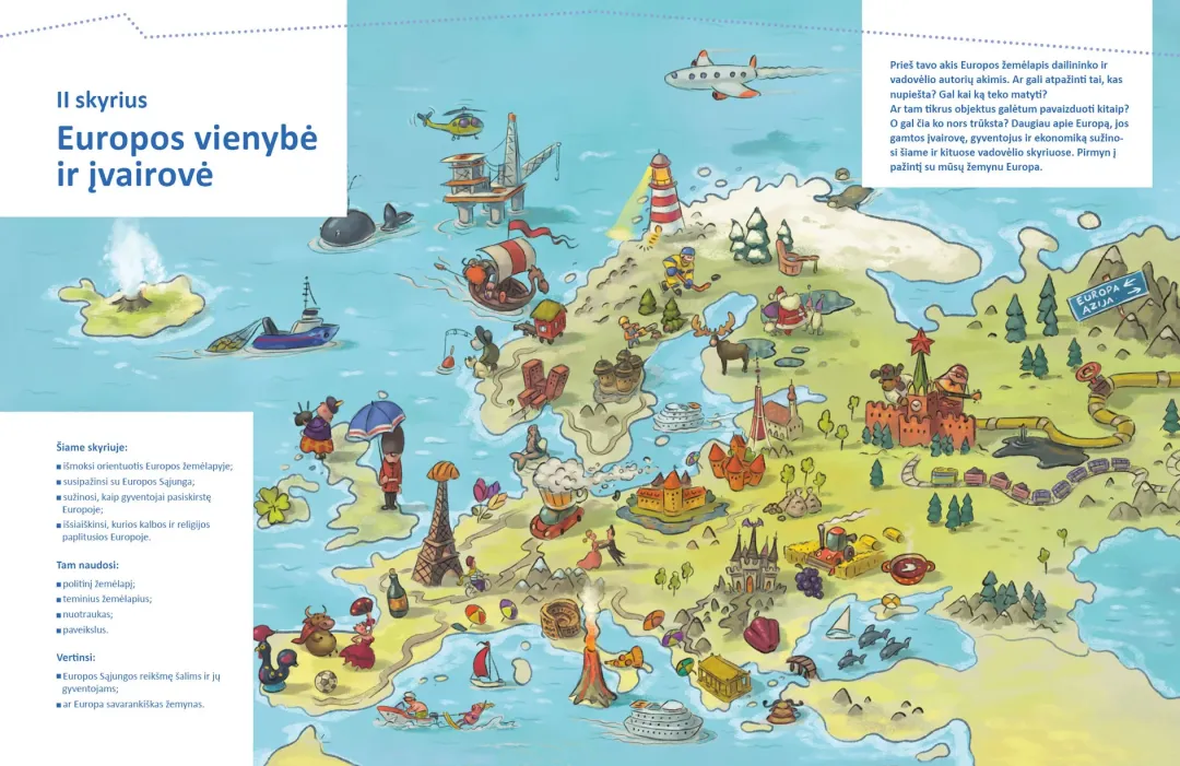 Mokomąją medžiagą papildo realybės kontekstai iš įvairiausių Lietuvos, Europos ir pasaulio vietų. Gausi dalykinė, kruopščiai didaktiškai parengta ir į mokinį orientuota iliustracinė medžiaga skatina atrasti, nagrinėti, vertinti ir lyginti. Sukurta reali galimybė diferencijuoti ugdymą, atlikti į ugdymo programą įtrauktus privalomuosius geografinius tyrimus, ugdyti gebėjimus bei įgūdžius.