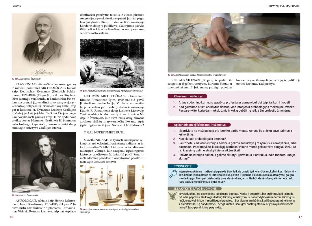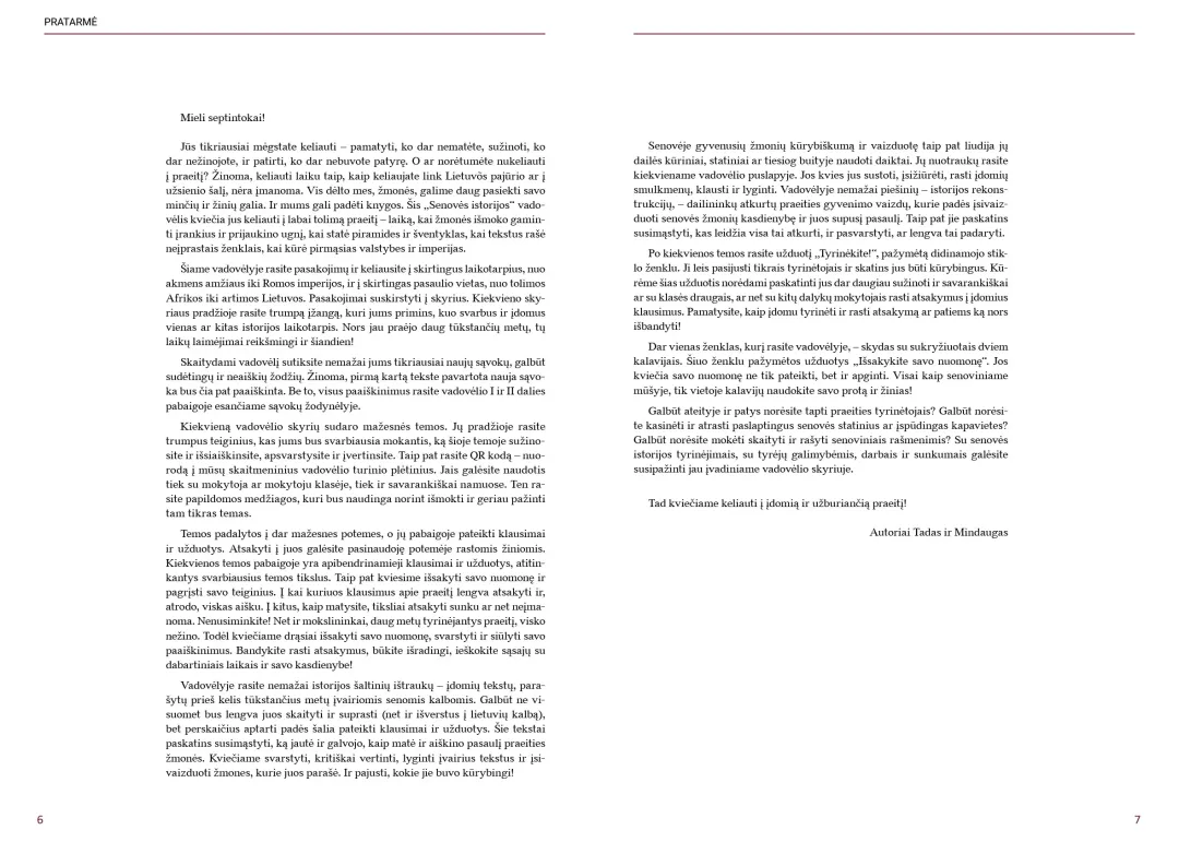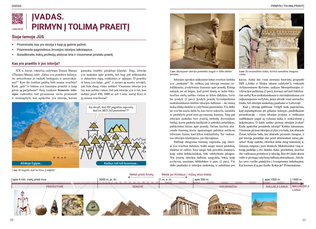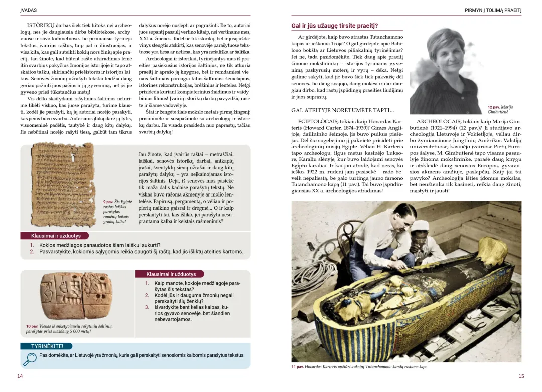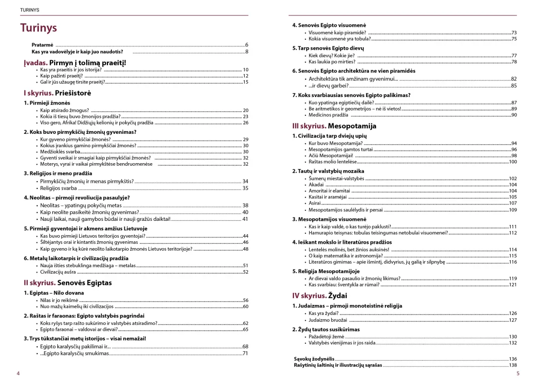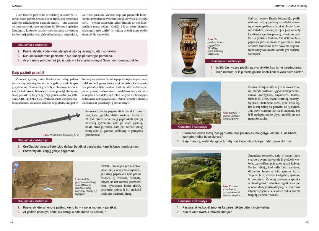 Vadovėlyje gausu rašytinių šaltinių. Dauguma jų versti iš senųjų kalbų, todėl mokiniai galės labiau įsitraukti į analizuojamus istorijos klausimus. Taip pat gausu vaizdinės medžiagos, kuri praplečia supratimą, skatina vaizduotę. Temos struktūruotos: kiekvienos temos pradžioje pateikti pagrindiniai uždaviniai, yra potemės, padedančios suvokti ir įsisavinti medžiagą. Daug įvairaus tipo ir sudėtingumo užduočių. Šis vadovėlis taip pat padės ugdytis dalykinius gebėjimus ir kompetencijas, kels probleminius klausimus ir padės ieškoti atsakymų, skatins tyrinėti, domėtis supančia aplinka, mokys ieškoti reikiamų žinių.