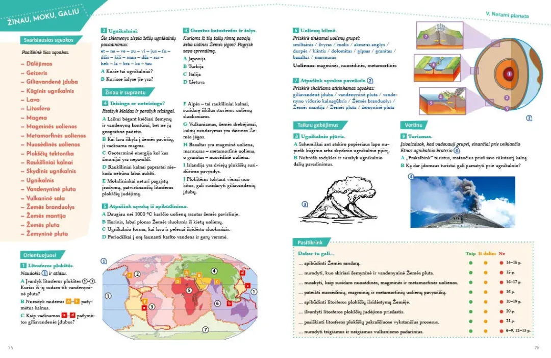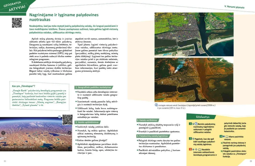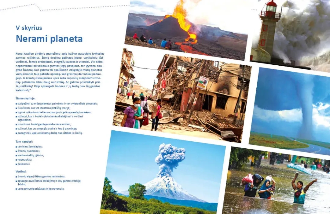 Vadovėlio mokomąją medžiagą papildo realybės kontekstai iš įvairiausių Lietuvos, Europos ir pasaulio vietų. Gausi dalykinė, kruopščiai didaktiškai parengta ir į mokinį orientuota iliustracinė medžiaga skatina atrasti, nagrinėti, vertinti ir lyginti. Sukurta reali galimybė diferencijuoti ugdymą, atlikti į ugdymo programą įtrauktus privalomuosius geografinius tyrimus, ugdyti gebėjimus bei įgūdžius.