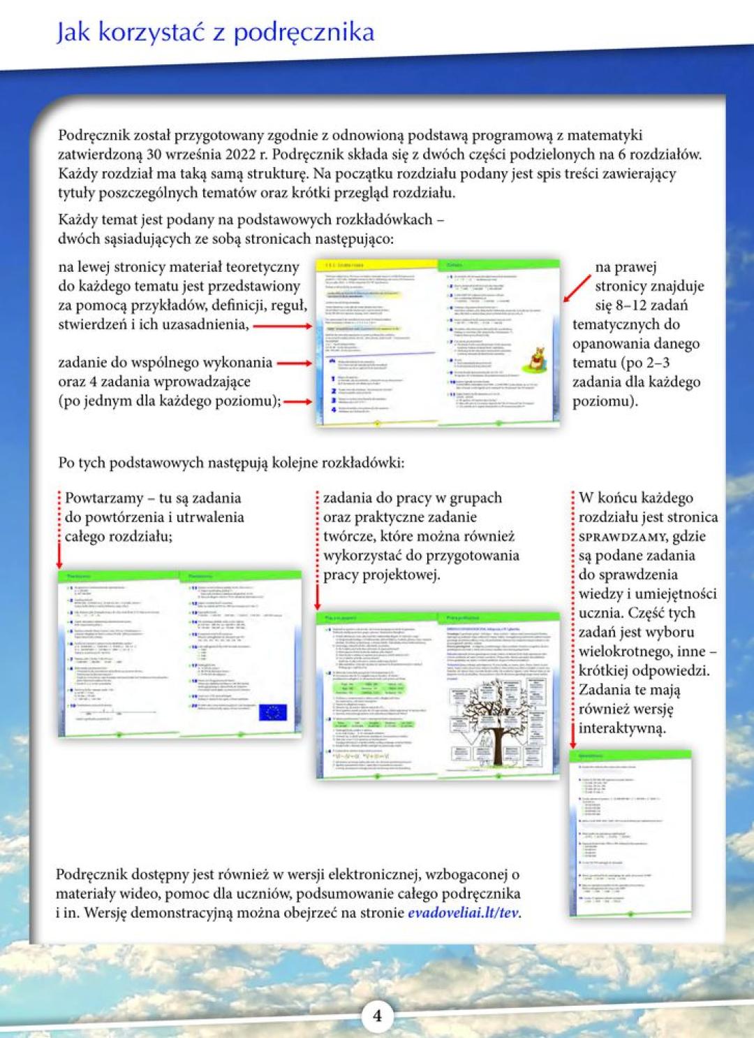 Vadovėlį sudaro dvi dalys. Kiekvienoje jų be teorinės medžiagos ir jai įsisavinti skirtų uždavinių, dar rasite papildančios medžiagos: kiekvieno skyriaus teorijos santrauką su pavyzdžiais, kartojimo ir pasitikrinimo užduotis, darbui grupėse skirtus uždavinius ir praktines užduotis bei smalsesniems skaitytojams skirtas matematines įdomybes. Vadovėlio gale yra pateikti kartojimo uždavinių atsakymai.