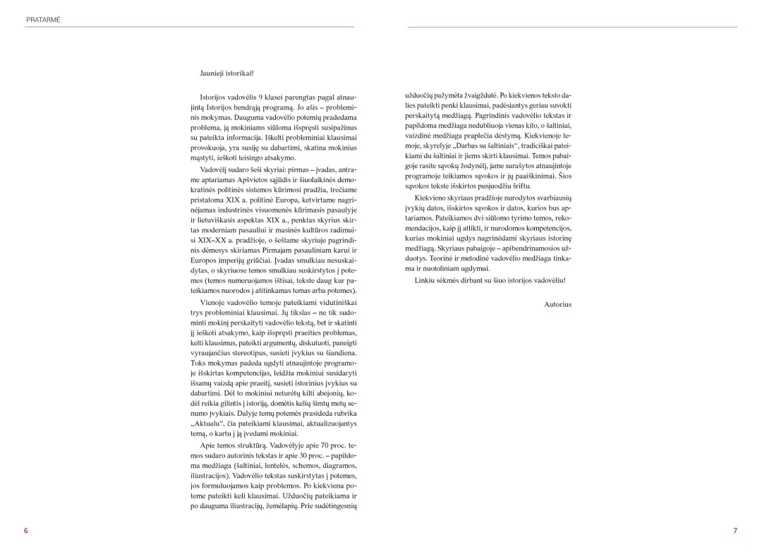 Istorijos vadovėlis 9 (I gimnazijos) klasei parengtas pagal 2022 m. atnaujintą istorijos bendrąją programą. Jo ašis – probleminis mokymas. Dauguma vadovėlio potemių pradedama problema, ją mokiniams siūloma išspręsti susipažinus su pateikta informacija. Iškelti probleminiai klausimai provokuoja, yra susiję su dabartimi, skatina mokinius mąstyti, ieškoti teisingo atsakymo.