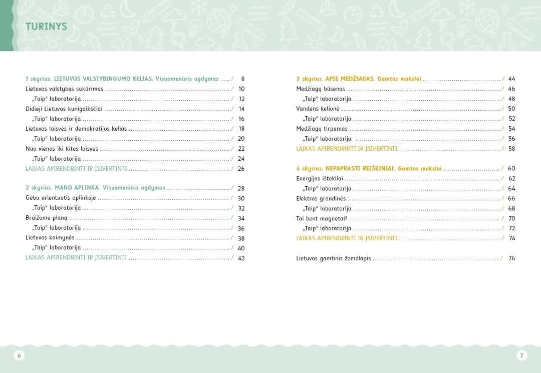 2.  Visuomeninis ugdymas  Vadovėlio turinyje ir skyrių pavadinimuose pateikiamos papildomos antraštės: Gamtos mokslai arba Visuomeninis ugdymas. Šios antraštės nurodo, kokio dalyko mokomasi.