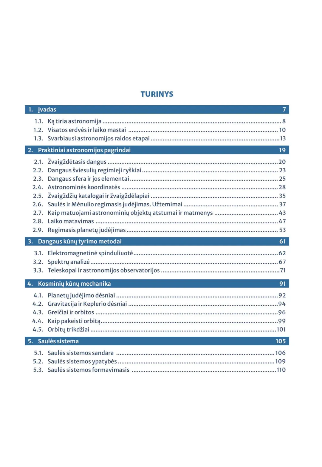 Astronomijos vadovėlį 11–12 klasei sudaro dvi dalys. Pirmoje dalyje aptariami praktiniai astronomijos pagrindai, dangaus kūnų tyrimo metodai, kosminių kūnų mechanika. Pateikiami ne tik astronomijos mokslo pagrindai, bet ir naujausios žinios apie Visatą, aprašomi šiuolaikiniai jos tyrimo metodai. Vadovėlis gausiai iliustruotas nuotraukomis, brėžiniais ir piešiniais, medžiaga papildyta nuorodomis į interaktyvias skaitmenines priemones. Kiekviena tema baigiama klausimais ir užduotimis (yra ir skaitiniai atsakymai savikontrolei), o kiekvienas skyrius – svarbiausių dalykų santrauka.