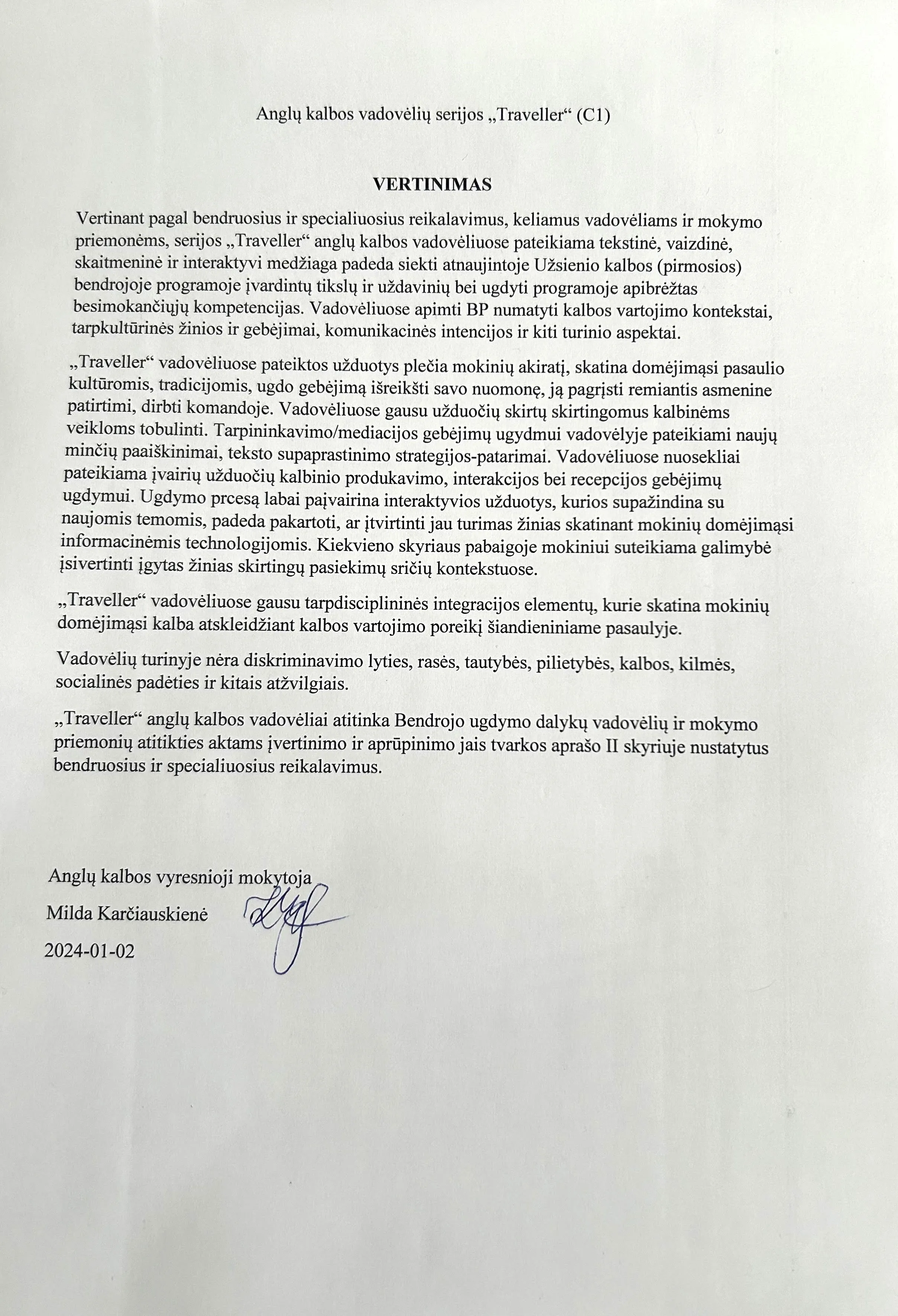 Vadovėlis „Traveller C1“ yra vienas iš septynių lygių serijos vadovėlių. Kalbos mokėjimo lygis pagal BEKM – C1