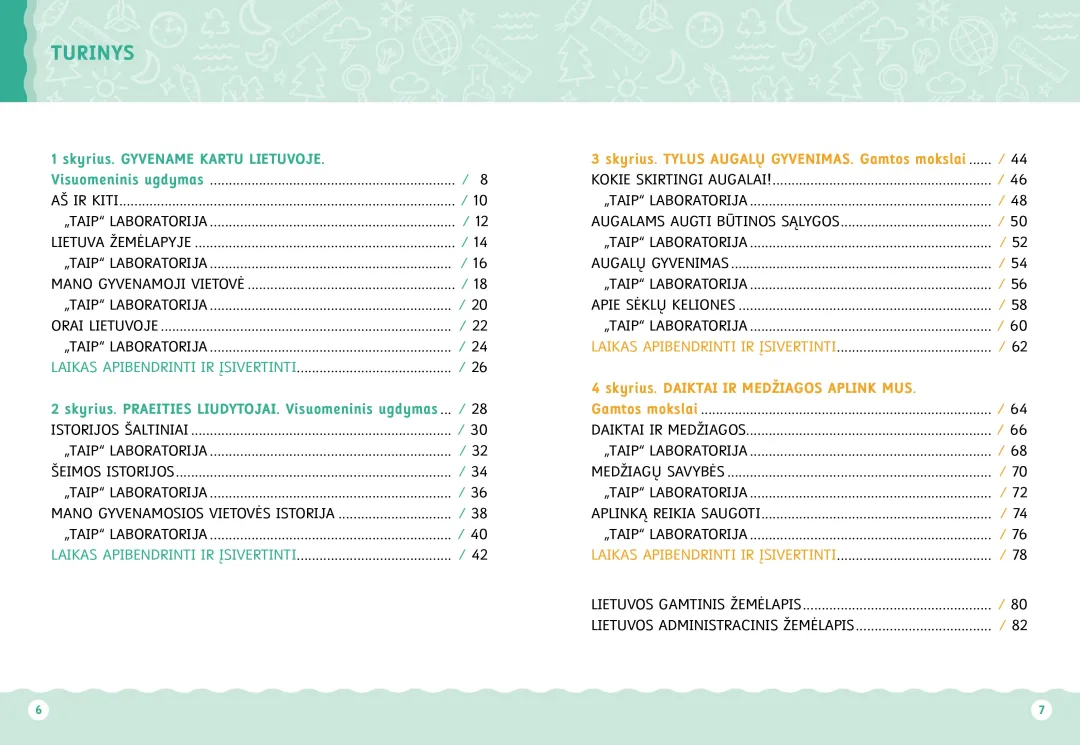 Vadovėlio turinys perteiktas per 2 atskiras programas: gamtos mokslų ir ir visuomeninio ugdymo. Vadovėlio turinyje ir skyrių pavadinimuose pateikiamos papildomos antraštės: gamtos mokslai ir visuomeninis ugdymas. Šios antraštės nurodo, kokio dalyko mokomasi.
