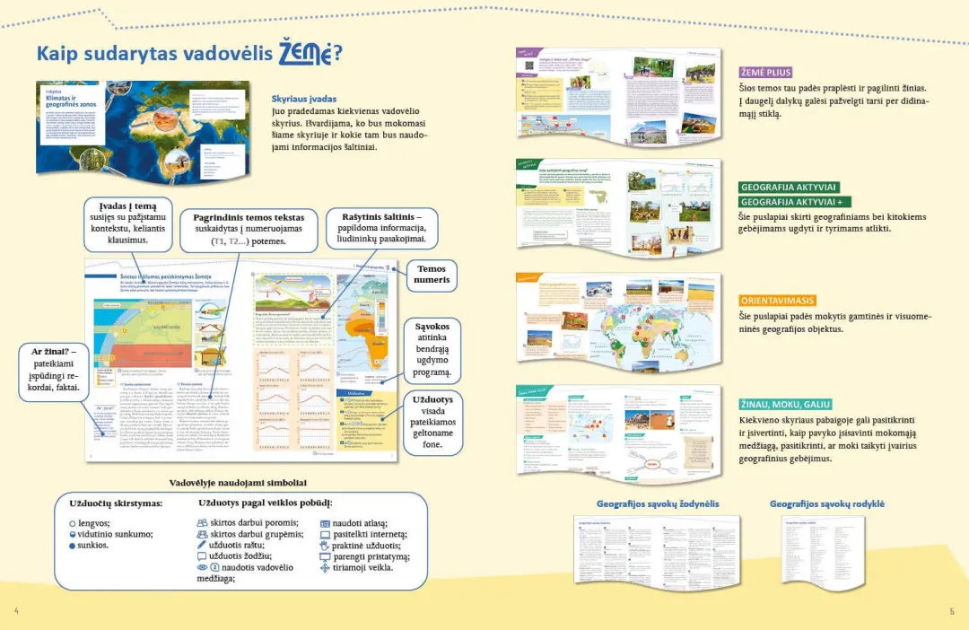 Gausi dalykinė, kruopščiai didaktiškai parengta ir į mokinį orientuota iliustracinė medžiaga skatina atrasti, nagrinėti, domėtis. Daug dėmesio skiriama galimybėms diferencijuoti ugdymą, atlikti į ugdymo programą įtrauktus privalomuosius geografinius tyrimus, ugdyti gebėjimus bei įgūdžius.