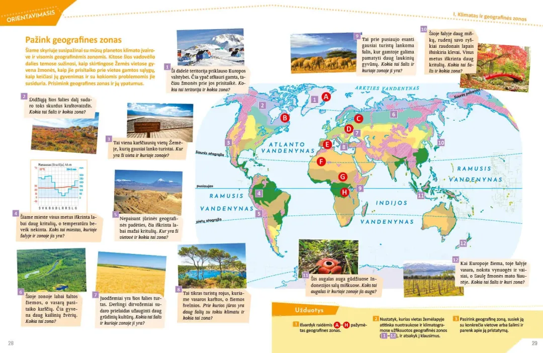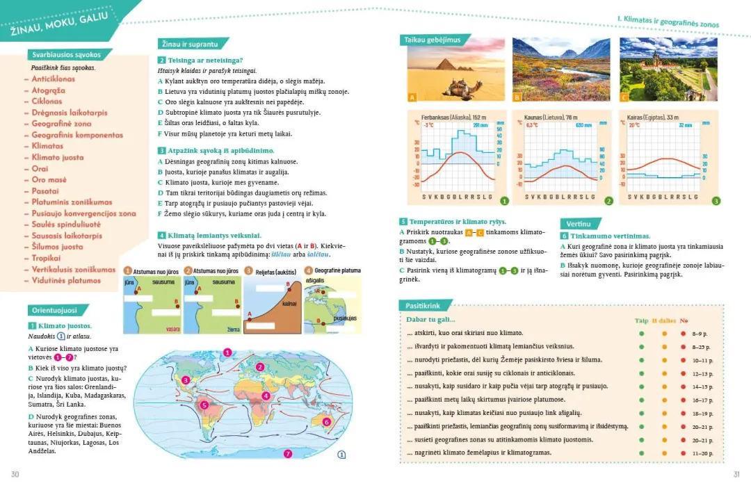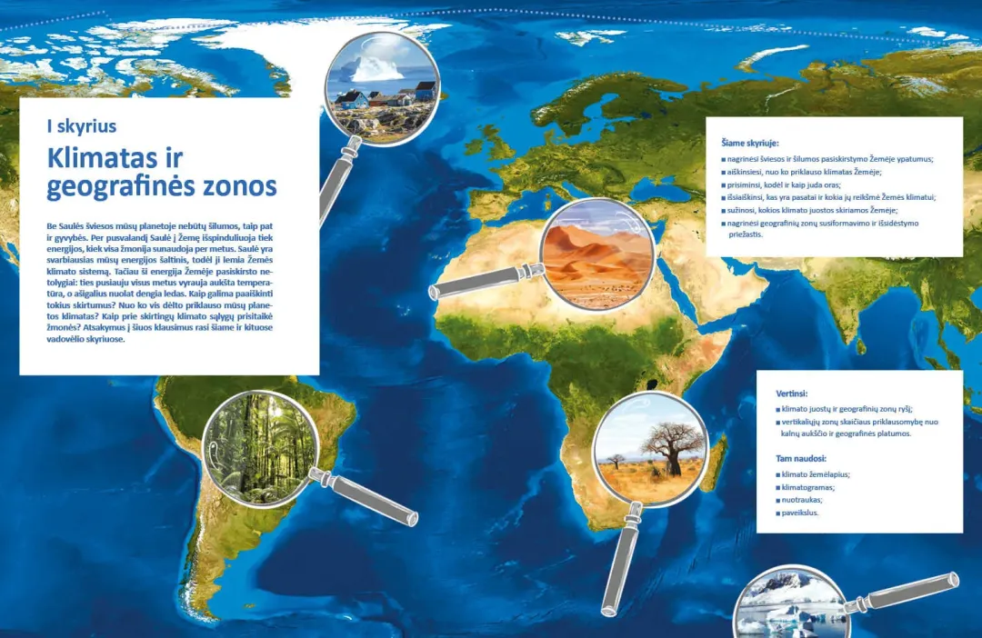 Pagrindinės temos apima esminius klimato dėsningumus, platuminio ir geografinio zoniškumo kontekstus. Naujoviškai ir netradiciškai pateikiamos programoje numatytos drėgnųjų atogrąžų miškų, savanų, dykumų geografinės zonos bei poliarinės sritys. Didžiulis dėmesys skiriamas gamtiniams ypatumams, žmonių ūkinei veiklai ir šio ryšio problematikai atskleisti. Pagrindines temas papildo patrauklios ir įtraukiančios pasirenkamosios temos, pristatančios realybės kontekstus iš įvairių pasaulio vietų.