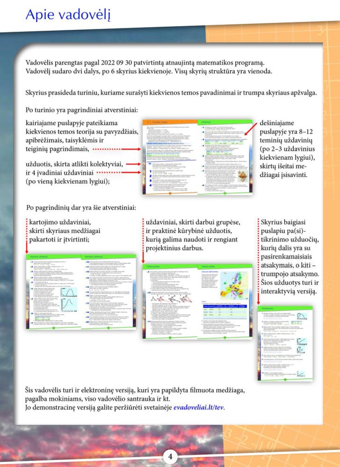 Šis vadovėlis yra orientuotas į mokinį, mokymosi medžiaga pritaikyta įvairių gebėjimų mokiniams. Autorės stengėsi turinį kuo labiau susieti su šio amžiaus mokinių patirtimis bei realiu gyvenimu. Rengiant vadovėlį buvo stengiamasi kiekvienam mokiniui sudaryti galimybę per matematikos mokymosi turinį ugdytis matematinį ir statistinį raštingumą, mokytis matematiškai samprotauti ir įgytas kompetencijas taikyti kasdienių, realių, aktualių ir mokiniams suprantamų problemų sprendimui.