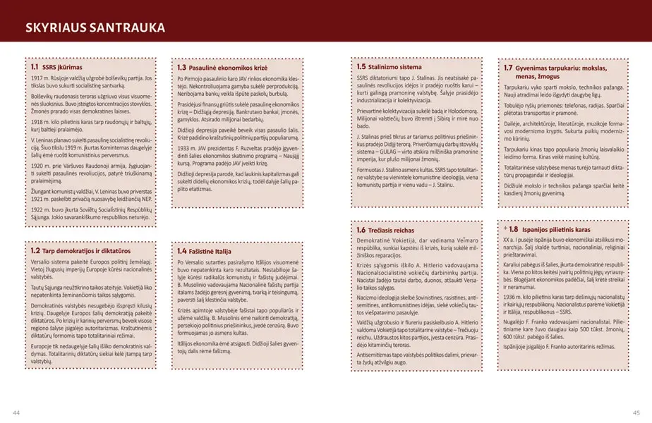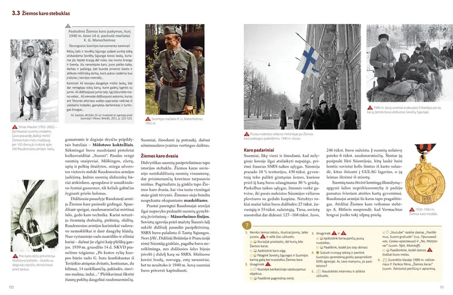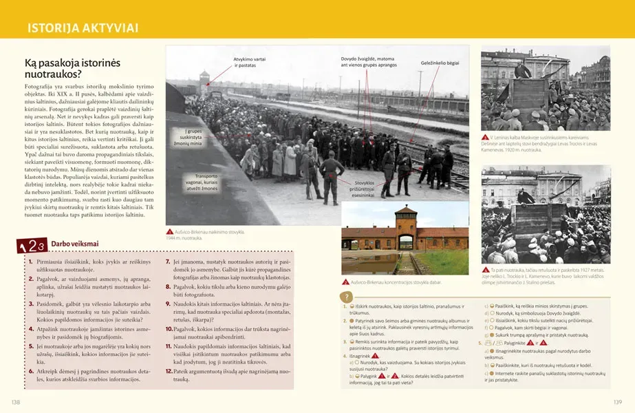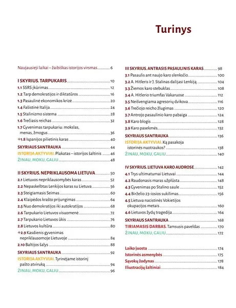 Šalia pagrindinių temų pateikiamos papildomos temos „Plius“ bei „Istorija aktyviai“ veiklos, skirtos padengti 30 % mokytojo laisvai pasirenkamo turinio. Vadovėlyje taip pat rasite tiriamąjį darbą, skirtą trauminiam sovietinės ir nacistinės okupacijų Lietuvoje paveldui, skyriaus santraukas, žinių ir kompetencijų patikros puslapius „Žinau, moku, galiu“.