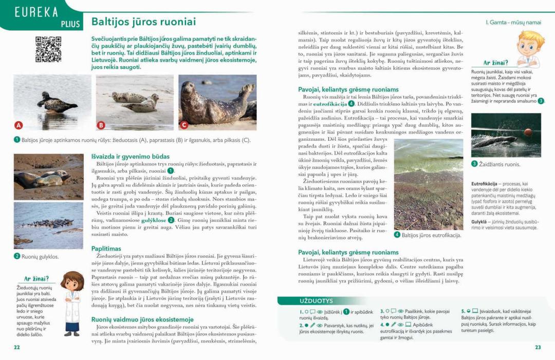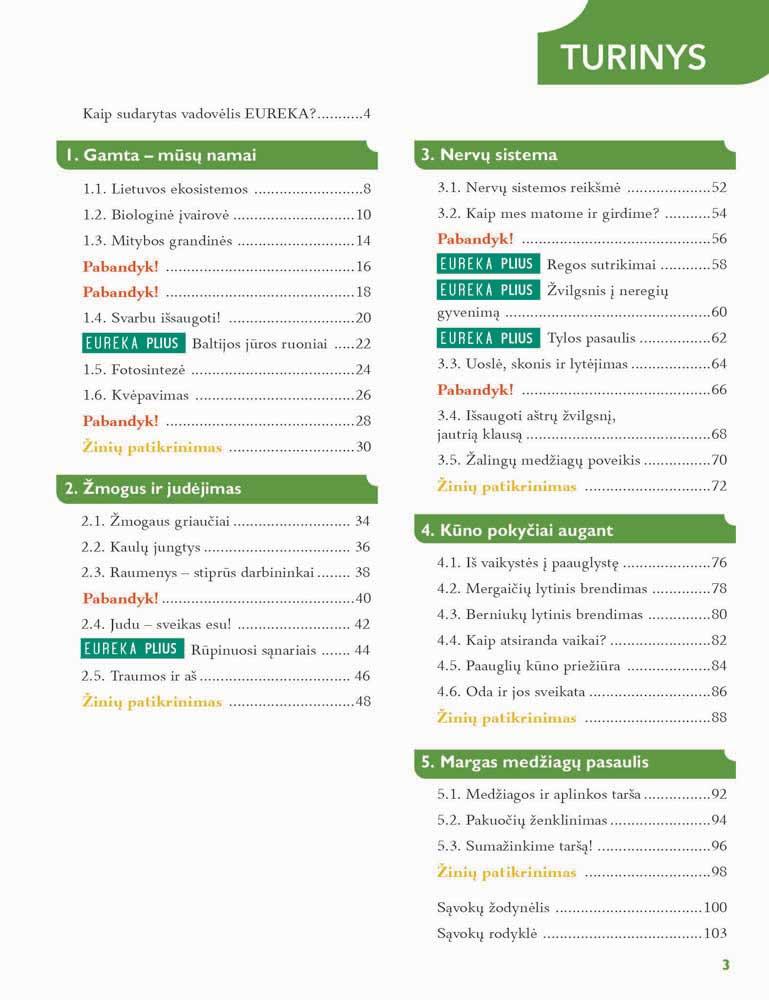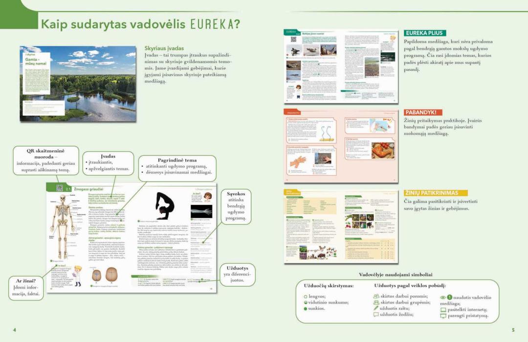 Eureka Plius – tai papildomos temos, kurios skirtos žinioms pagilinti, akiračiui praplėsti. Rubrika „Pabandyk!“ siūlo mokiniams pritaikyti įsisavintas žinias praktikoje ir atlikti įdomius bandymus. Kiekvieno skyriaus pabaigoje rasite „Žinių patikrinimą“, skirtą mokinių gebėjimams vertinti.