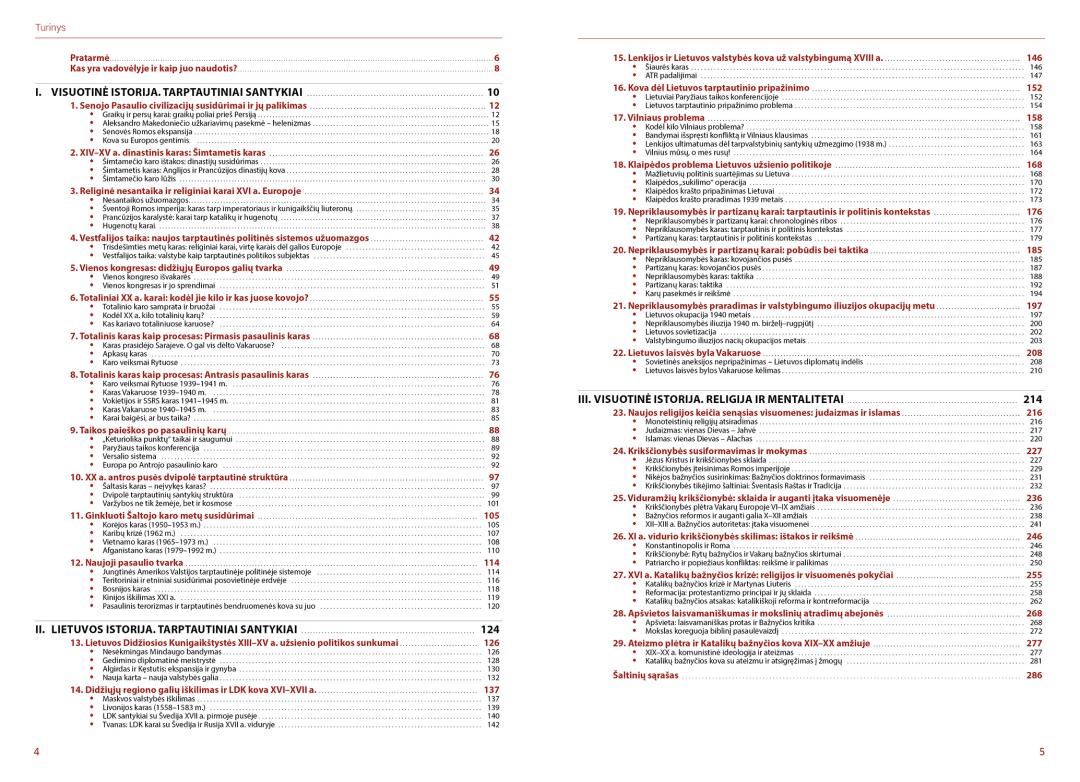 IV gimnazijos kl. vadovėlio I dalyje pateikiamos dvi temų grupės, padalytos į visuotinės ir Lietuvos istorijos skyrius.