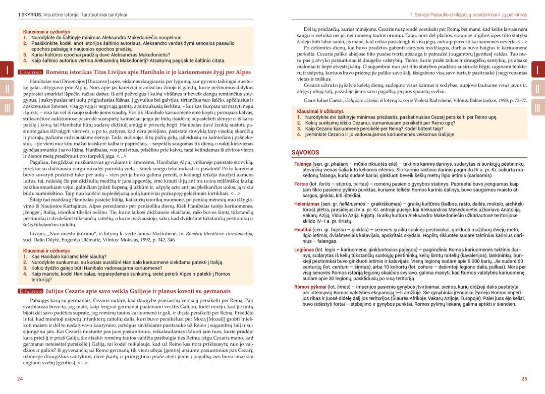 Po kiekviena temos poteme pateikiama klausimų ir užduočių, po visa tema yra apibendrinamųjų klausimų, smalsumą skatinančių užduočių, kviečiančių dirbti savarankiškai, vertybinių ir nuomonės klausimų. Šios užduotys padeda geriau suvokti pateiktą medžiagą, skatina tyrinėti, kritiškai mąstyti, argumentuotai išsakyti nuomonę istorijos temomis. Beveik visų temų pabaigoje – sąvokų žodynėlis, jame surašytos svarbiausios tos temos sąvokos ir jų paaiškinimai.