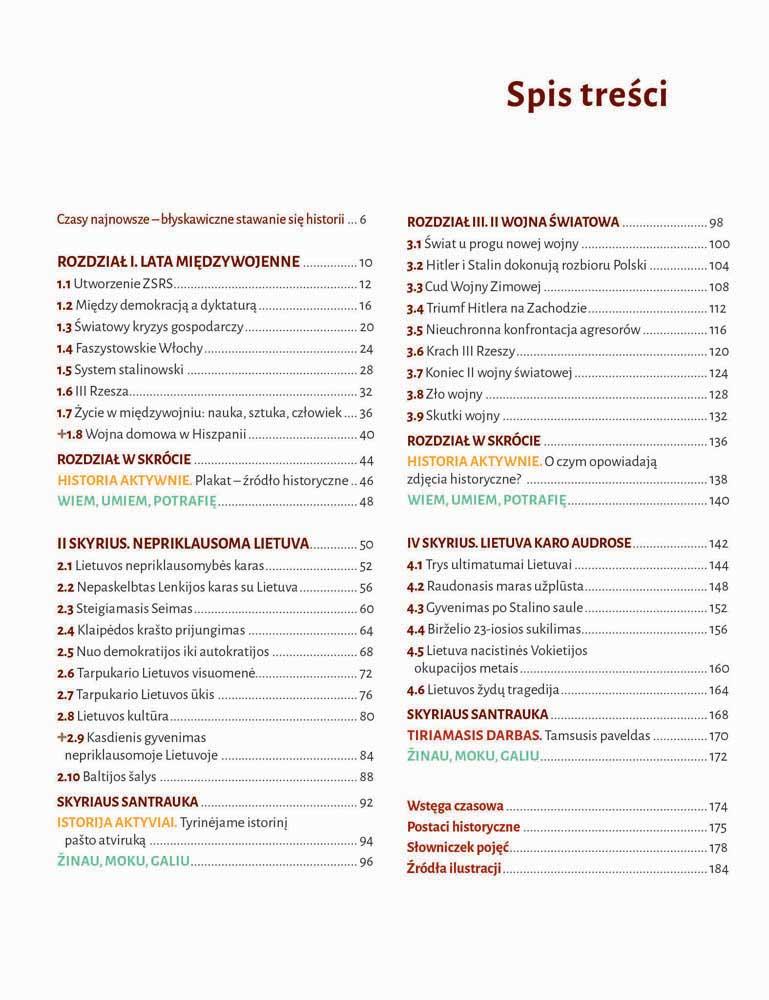 Šalia pagrindinių temų pateikiamos papildomos temos „Plius“ bei „Istorija aktyviai“ veiklos, skirtos padengti 30 % mokytojo laisvai pasirenkamo turinio. Vadovėlyje taip pat rasite tiriamąjį darbą, skirtą trauminiam sovietinės ir nacistinės okupacijų Lietuvoje paveldui, skyriaus santraukas, žinių ir kompetencijų patikros puslapius „Žinau, moku, galiu“.