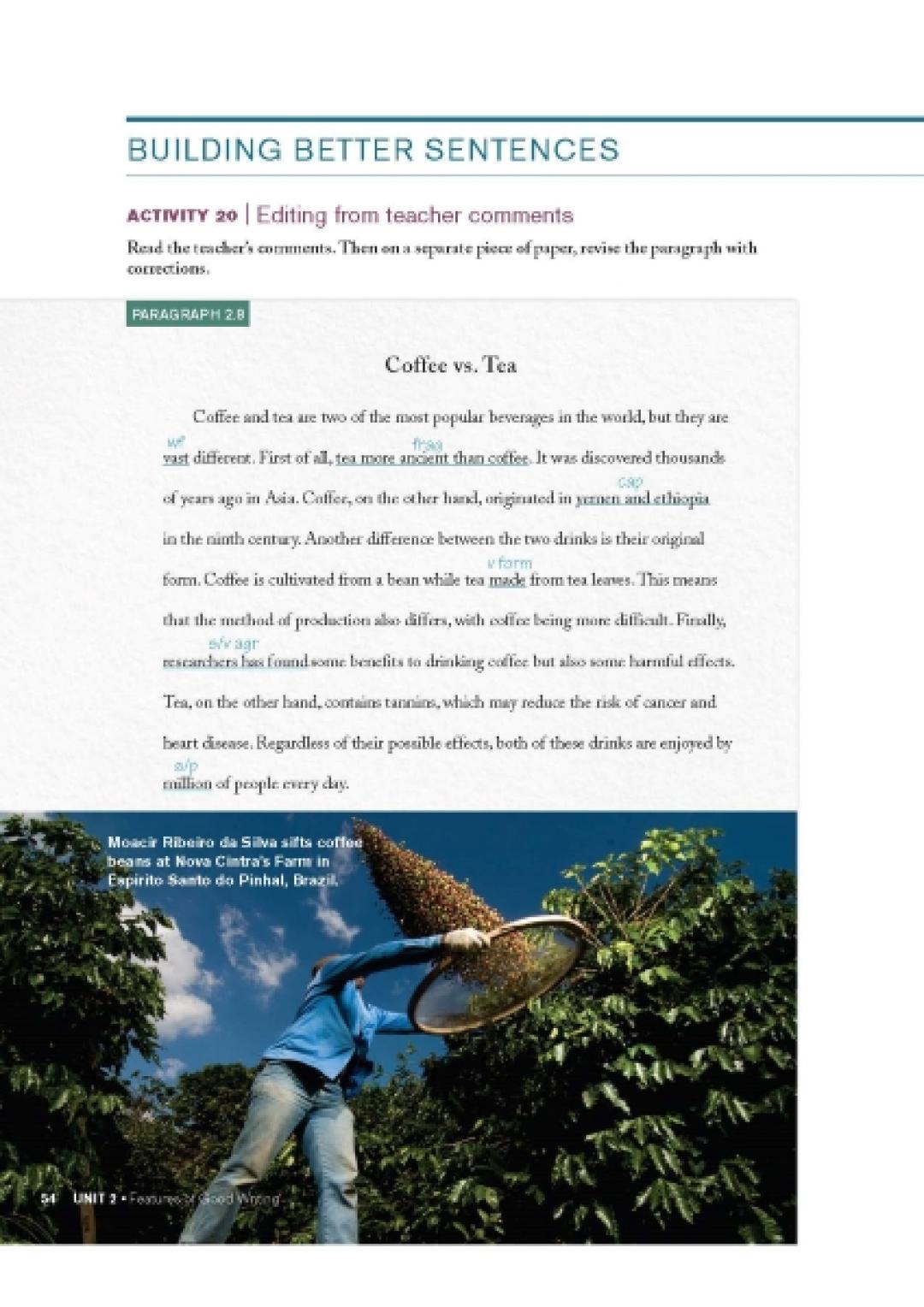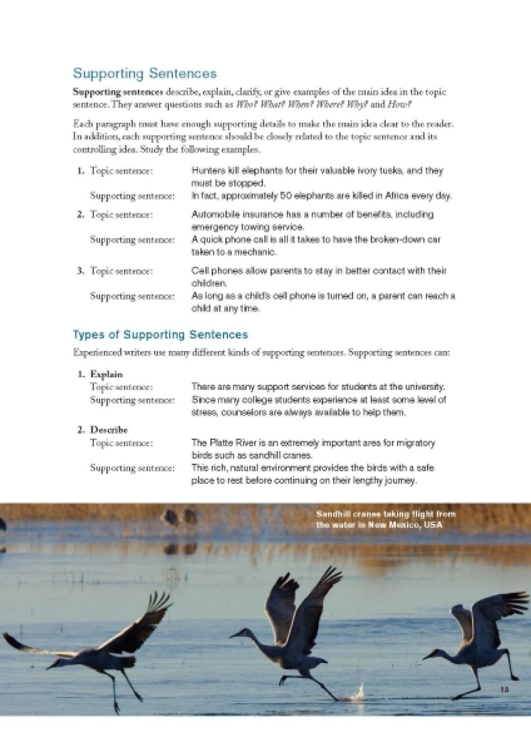 Skyriaus pradžioje pateikiami numatomi skyriaus tikslai. Rašymo užduotys grindžiamos nuoseklia veikla – ši dalis suteikia detalias gaires apie pagrindinius rašymo principus, įskaitant gramatiką. „WORDS TO KNOW“ skiltyje, žodžių banko veikla pateikiama kartu su modeliniais esė. Šiose skiltyse žodžiai pateikiami nurodant kalbos dalį ir apibrėžtį.