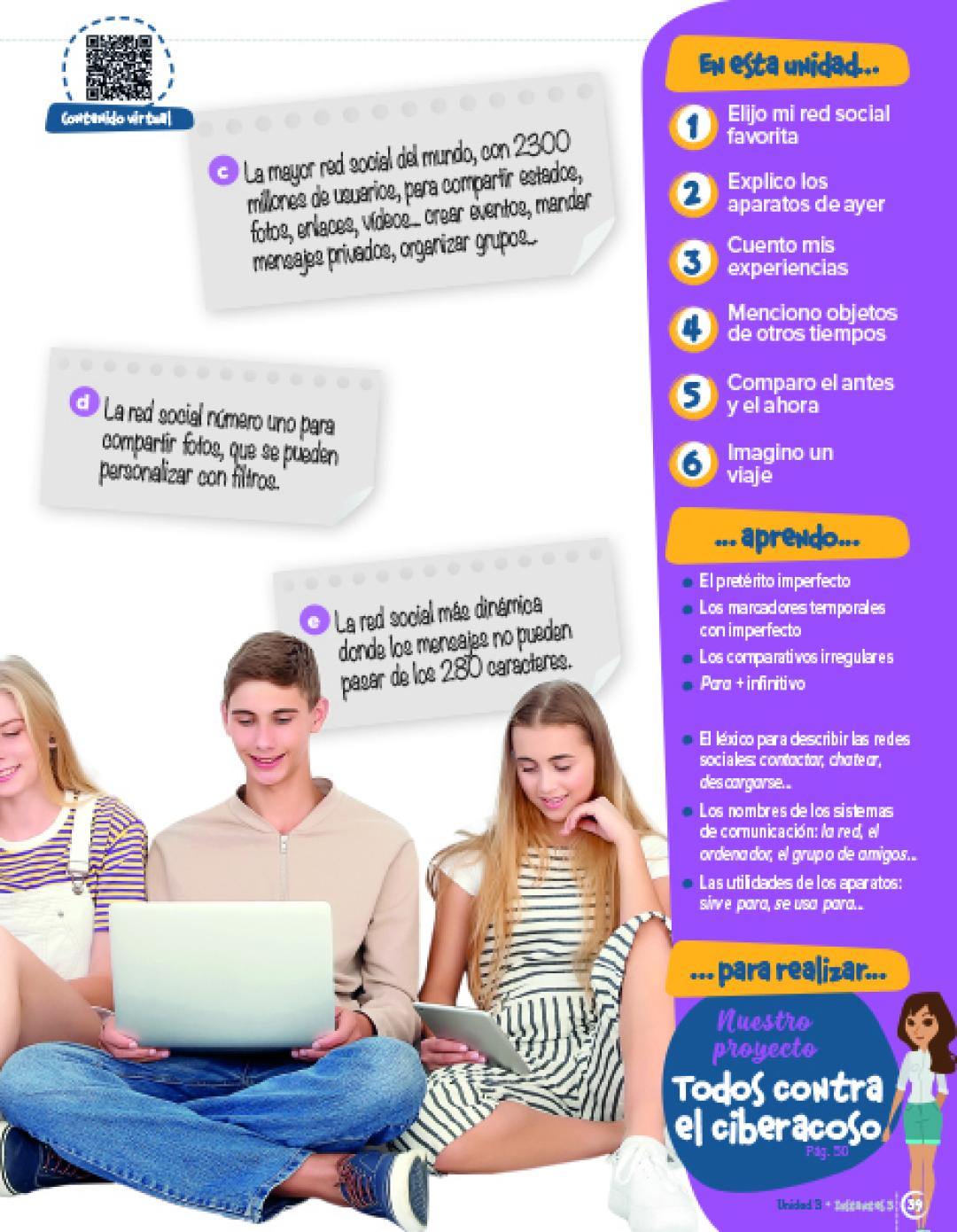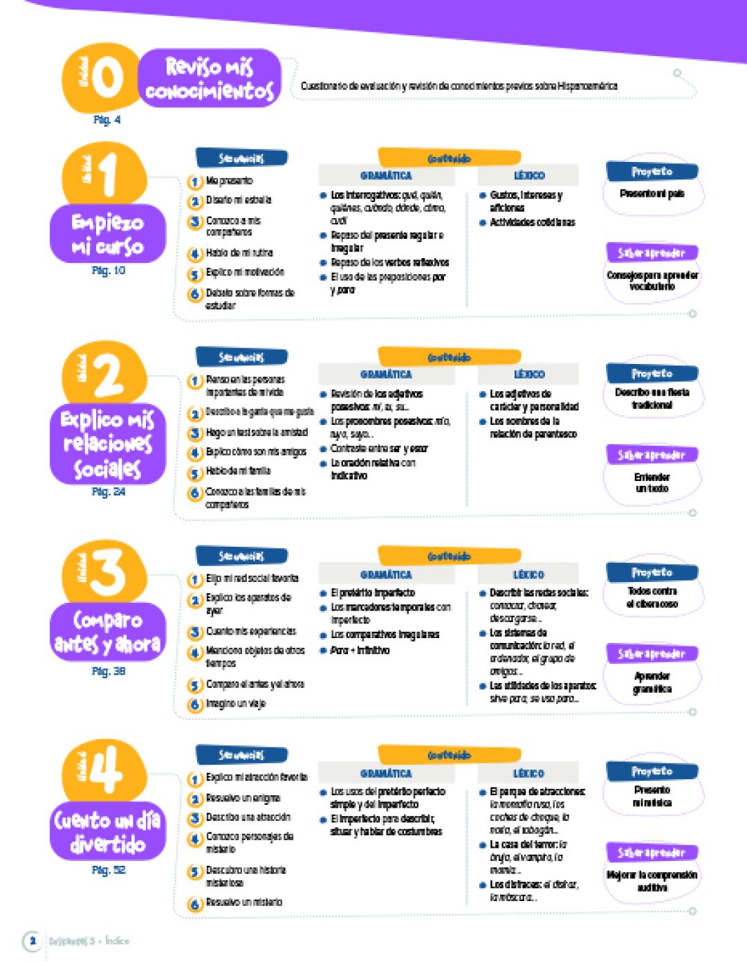 Vadovėlis sukurtas siekiant skatinti aktyvų mokinių dalyvavimą mokymosi procese, stiprinti jų asmeninį tobulėjimą, socialinę sąmonę, empatiją, komunikacinius įgūdžius ir plėtoti tarpdalykinį požiūrį. Vadovėlis orientuotas į socialinį-kultūrinį mokymąsi, aktualias paaugliams temas ir autentiškas situacijas, kurios atspindi realų gyvenimą. Vadovėlis tinkamas ugdyti šio lygio Bendrojoje programoje numatytas 2-osios užsienio (ispanų) kalbos dalyko ir bendrąsias kompetencijas.