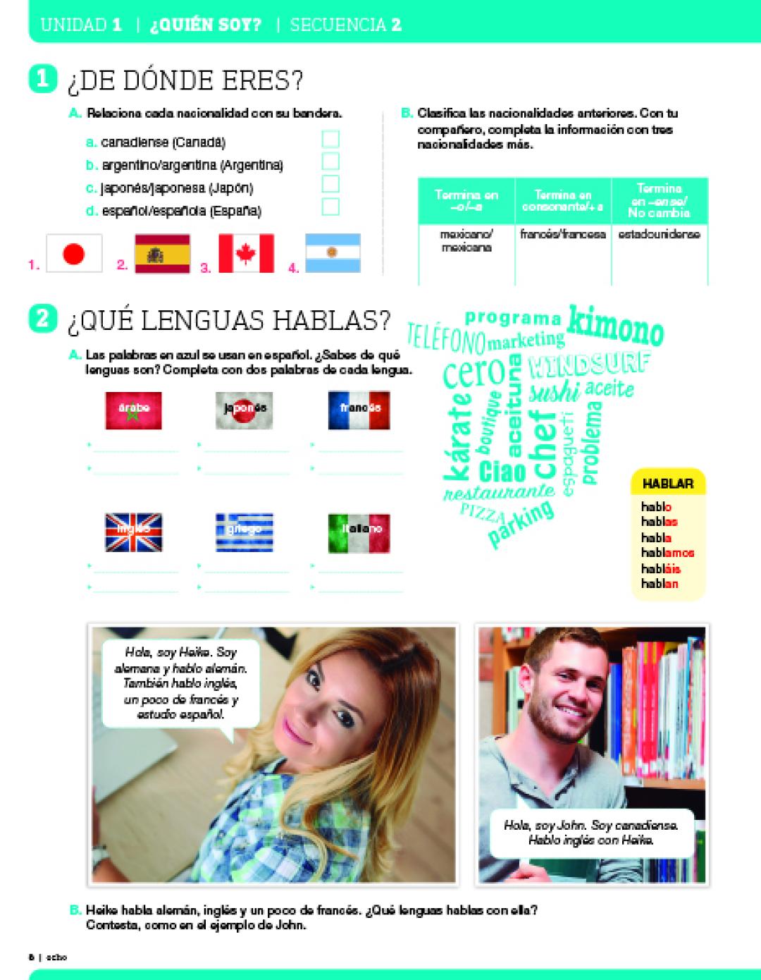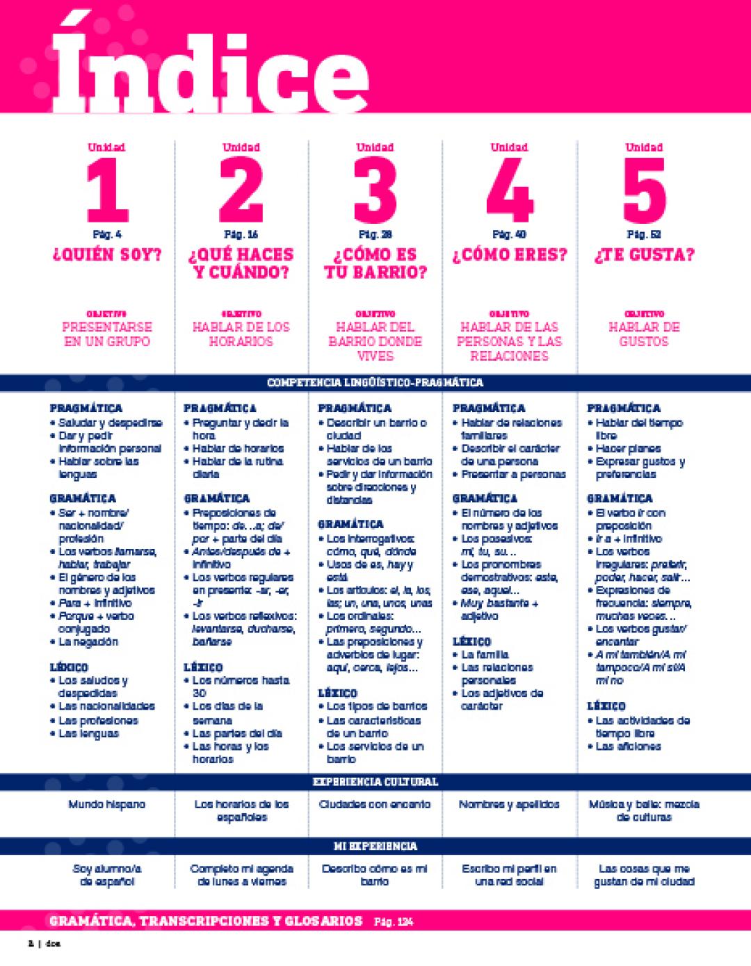 Vadovėlis orientuotas į realaus gyvenimo situacijas ir tikslus, siekiant skatinti besimokančiųjų motyvaciją, socialinių ir komunikacinių gebėjimų plėtrą bei kultūrinį sąmoningumą. Dėmesys skiriamas ne tik kalbinių žinių kaupimui, bet ir asmeniniam besimokančiojo tobulėjimui, socialinei integracijai, empatijai ir tarpkultūriniam dialogui. Vadovėlis tinkamas ugdyti šio lygio Bendrojoje programoje numatytas antrosios užsienio (ispanų) kalbos dalyko ir bendrąsias kompetencijas.