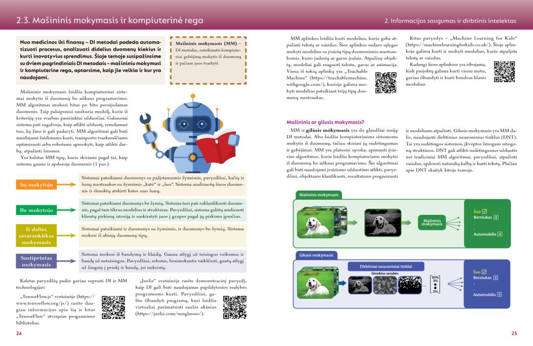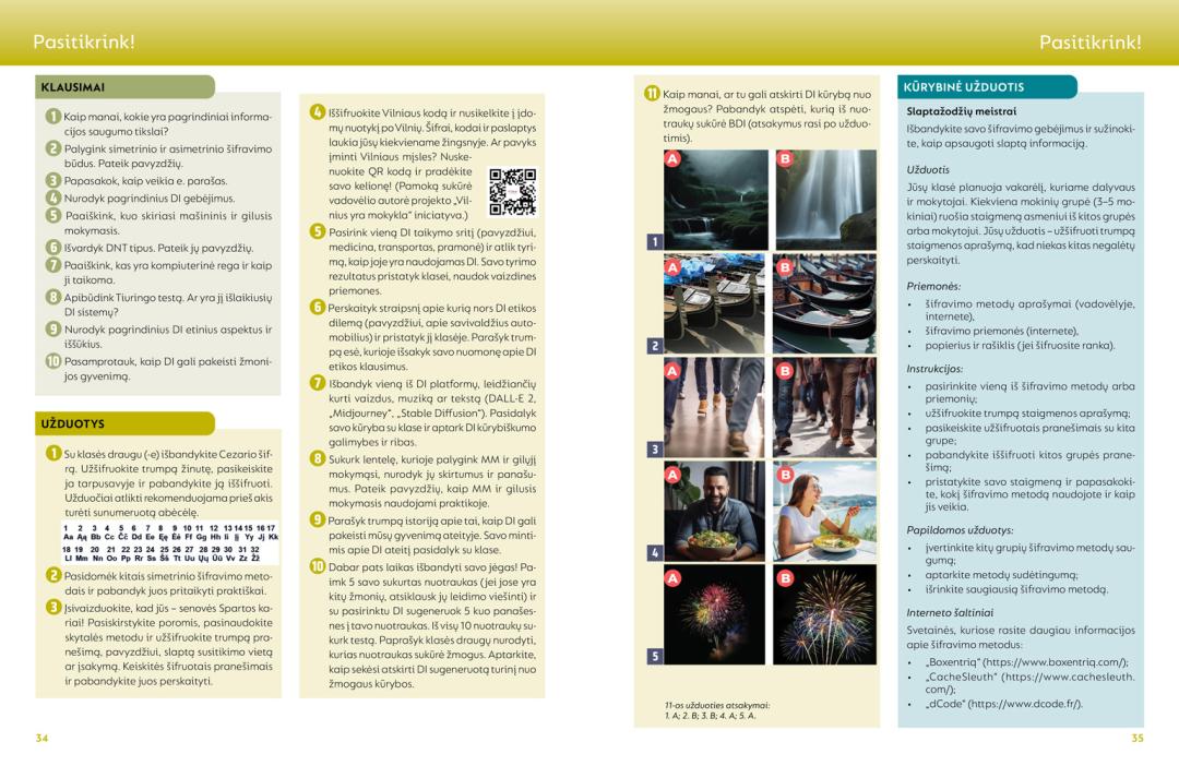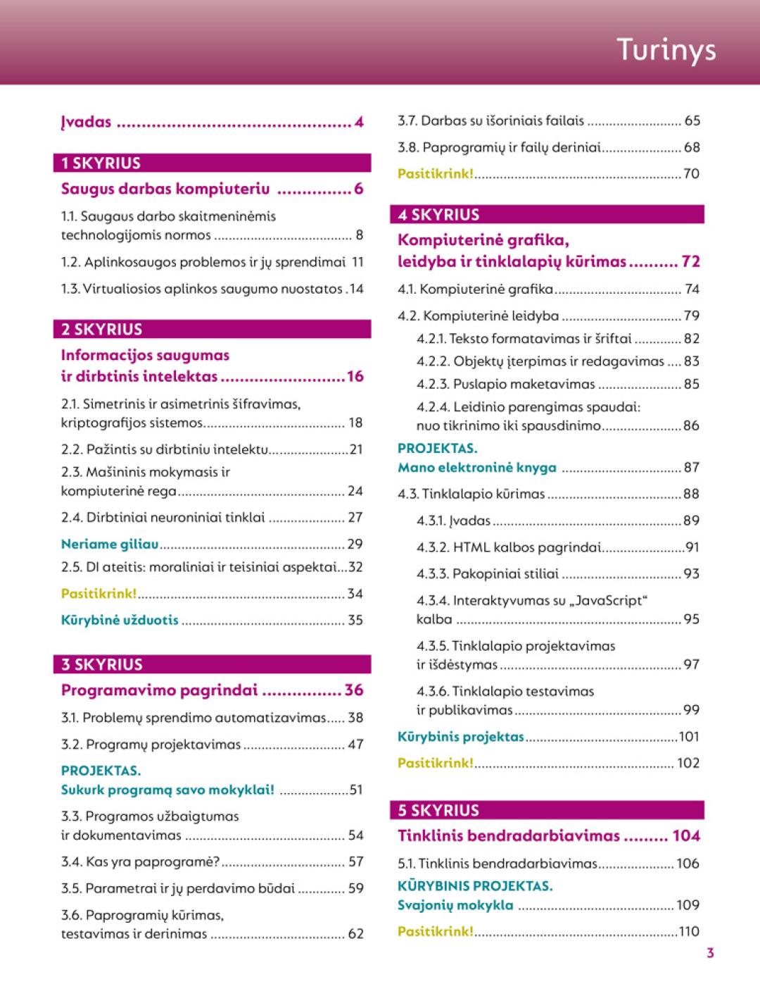 Vadovėlis išsiskiria vizualiai turtingu turiniu: kruopščiai parengtos schemos, aukštos kokybės iliustracijos ir koncentruotos infografikos padeda mokiniams lengviau įsisavinti net ir sudėtingiausius informatikos principus. Praktiniai realaus gyvenimo pavyzdžiai ir stimuliuojančios užduotys ne tik sustiprina programavimo įgūdžius, bet ir atveria platesnį informacinių technologijų pasaulį, demonstruodamos jų universalumą ir galimą poveikį ateities profesijoms. Vadovėlis siekia ne tik suteikti žinių, bet ir įkvėpti mokinius tapti aktyviais ir kūrybingais technologijų vartotojais bei kūrėjais.