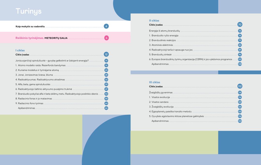 Komplekto leidiniuose: medžiaga skirstoma ciklais. Kiekvienas ciklas pradedamas iliustruotu įvadu, pristatančiu temas ir veiklas, padedančias ugdyti(s) įvairias kompetencijas. Ciklo pradžioje pateikta motyvuojanti įžanga atspindi ciklo turinį, susieja jį su gyvenimu ir skatina mokinį domėtis, analizuoti temas, atlikti užduotis. Tiriamiesiems ir kūrybiniams gebėjimams ugdyti(s) siūlomas reiškinio tyrinėjimo projektas. Toliau nagrinėjamos ciklo temos, ciklo pabaigoje pateikiamas apibendrinimas – teorijos santrauka, užduotys žinioms ir gebėjimams pa(si)tikrinti, į(si)vertinimas.