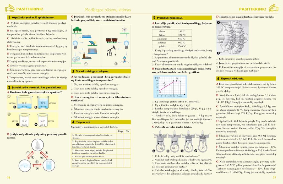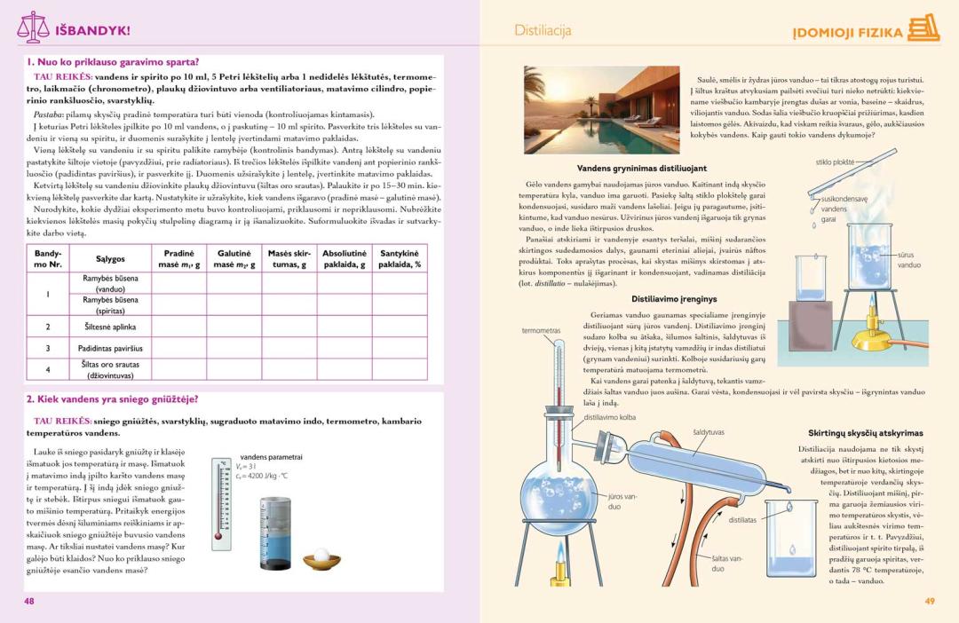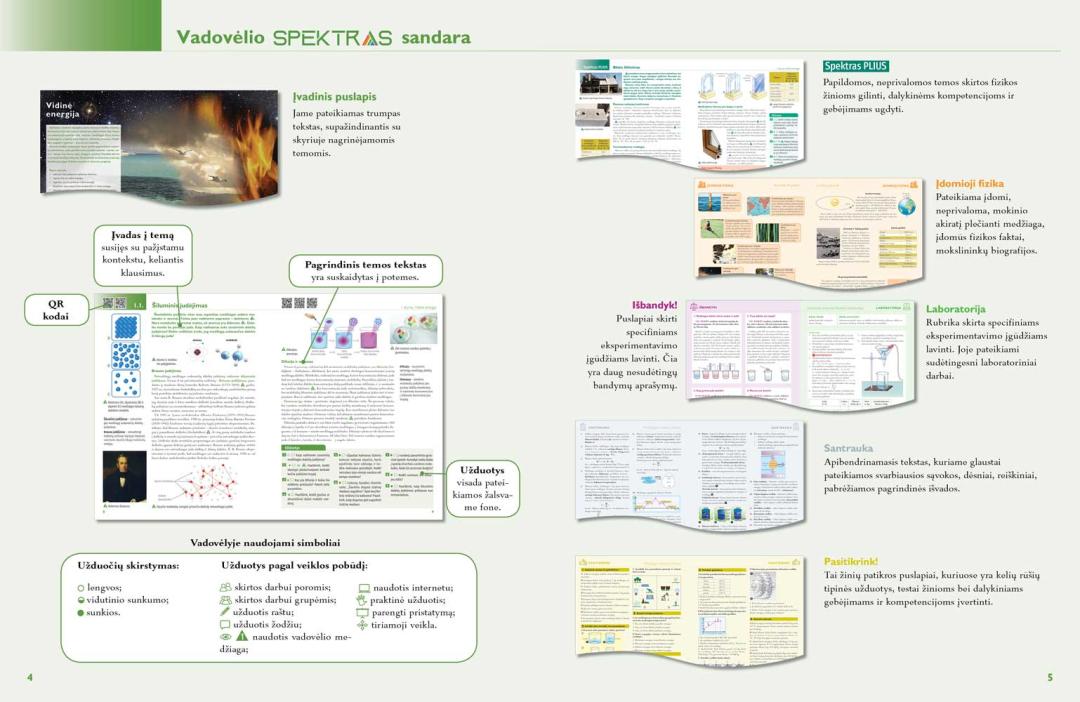 Vadovėlyje puikiai tarpusavyje siejama teorija ir praktika, kasdienis gyvenimas jungiamas su fizikos eksperimentais, kurie padeda sudominti ir aktyviau įtraukti mokinius į ugdymosi procesą. Vadovėlio temų tekstą pagyvina aiškios, į mokinį orientuotos iliustracijos, paprasti, iš artimiausios aplinkos parinkti pavyzdžiai. Jie padeda mokiniams geriau suprasti aptariamus fizikos dėsnius ir gamtos reiškinius, skatina domėtis, nagrinėti ir atrasti. Kiekvienoje temoje pateikta gausi dalykinė, kruopščiai parengta medžiaga, užduotys yra suskirstytos pagal skirtingus gebėjimus ir mokymosi lygius. Pagrindines vadovėlio temas papildo įtraukiančios „Spektras plus‘‘ temos, skirtos padengti 30 % mokytojo laisvai pasirenkamo fizikos ugdymo turinio. Nemažai papildomos ir įdomios, mokinių akiratį plečiančios medžiagos yra pateikiama rubrikoje „Įdomioji fizika“. Fizikos uždavinių sprendimo pavyzdžiai padės mokiniams geriau suprasti, kaip taikyti formules, keisti fizikinių dydžių matavimo vienetus. Rubrikoje „Išbandyk!“ siūlomi praktiniai bandymai, kurie ugdo mokinių pažinimo, kūrybiškumo, socialines, emocines ir sveikos gyvensenos kompetencijas. ,,Laboratorija‘‘ skirta specifiniams eksperimentavimo įgūdžiams lavinti, čia pateikiami sudėtingesni laboratoriniai darbai. Kiekvienas skyrius baigiamas „Santrauka“, kurioje apibendrinama išeita medžiaga, o žinias ir gebėjimus siūloma įsivertinti rubrikoje ,,Pasitikrink“.