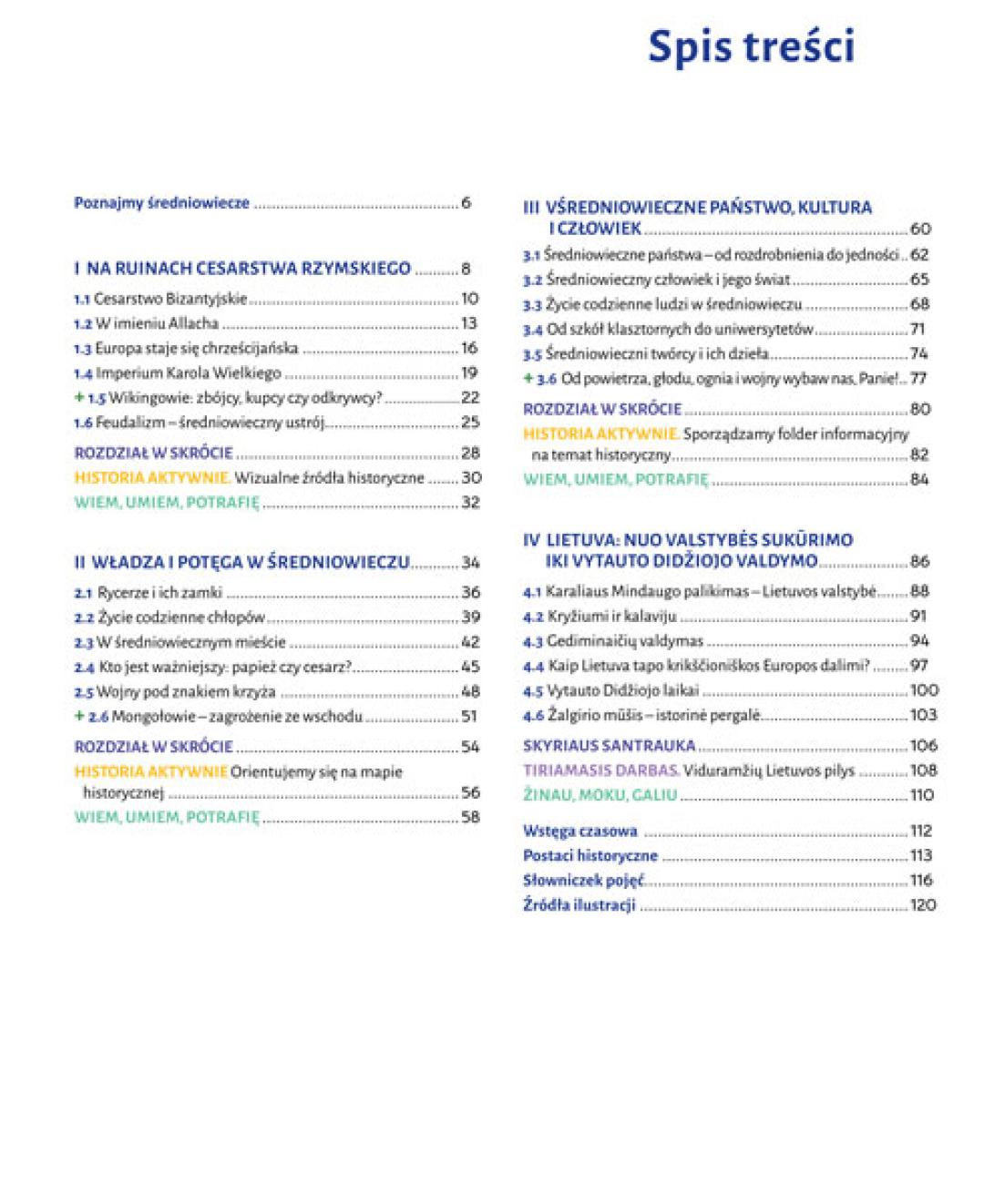 Šalia pagrindinių temų pateikiamos papildomos temos, tiriamasis darbas „Viduramžių Lietuvos pilys“ bei „Istorija aktyviai“ veiklos, skirtos padengti 30 % mokytojo laisvai pasirenkamo turinio. Vadovėlio skyriuose taip pat rasite medžiagos pasikartojimui ir įtvirtinimui skyriaus santraukas, žinių ir kompetencijų patikros puslapius „Žinau, moku, galiu“.