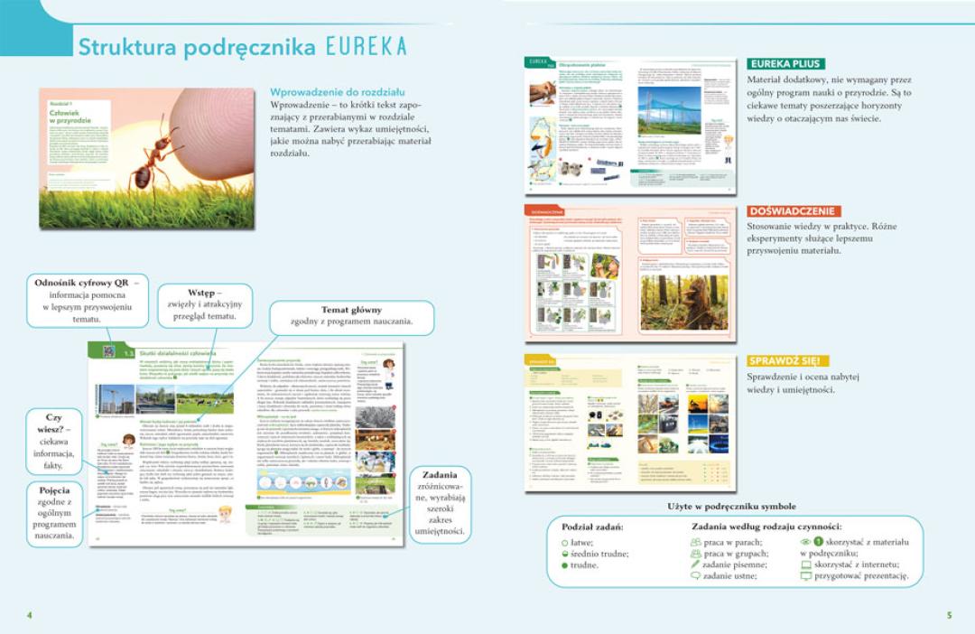 Vadovėlį sudaro: skyriaus įvadas, pagrindinė tema, „Eureka Plius“, rubrika „Pabandyk!“ ir „Žinių patikrinimas“. „Eureka Plius“ – papildomos temos, skirtos žinioms pagilinti ir akiračiui praplėsti. Rubrika „Pabandyk!“ siūlo mokiniams praktiškai pritaikyti įsisavintas žinias ir atlikti įdomius bandymus. Kiekvieno skyriaus pabaigoje pateiktas „Žinių patikrinimas“, skirtas mokinių gebėjimams vertinti.