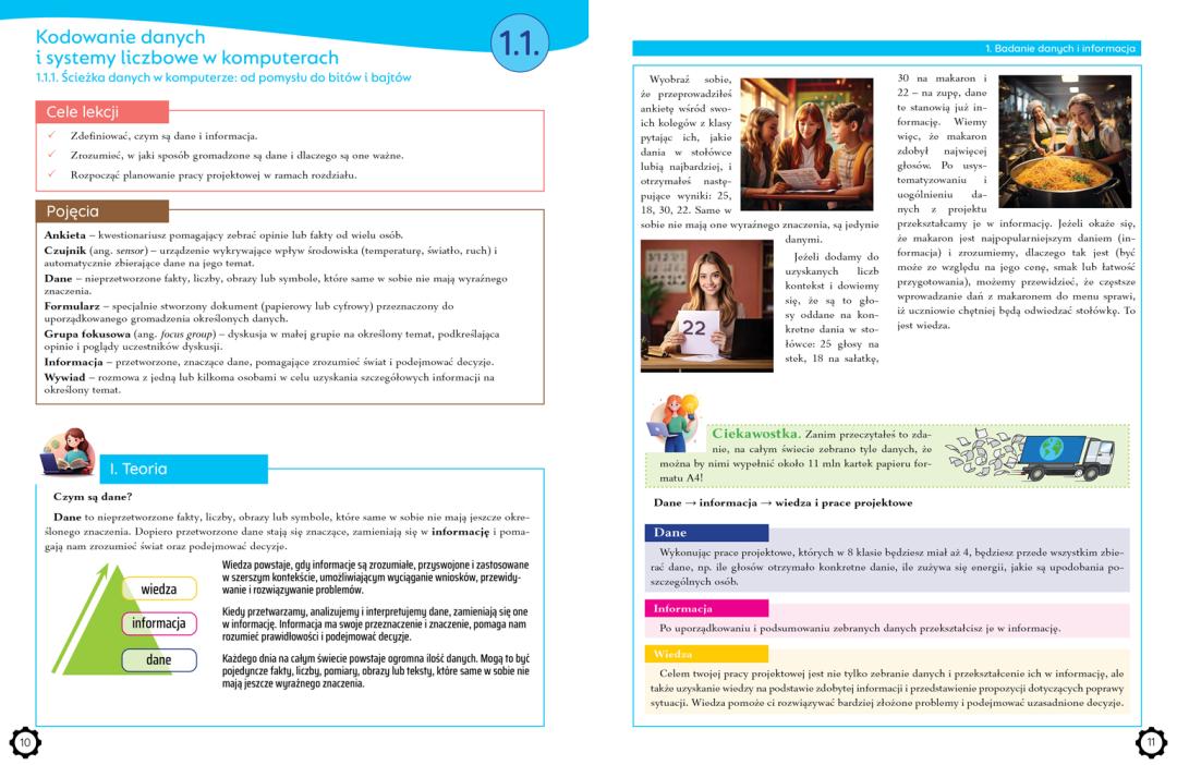 Vadovėlis išsamiai nagrinėja duomenų tyrybą ir informacijos valdymą, apimdamas duomenų kodavimą, sąryšių tyrinėjimą, glaudinimą ir šifravimo metodus. Papildomai mokiniai susipažins su kompiuterio techninės ir programinės įrangos sandara, tinklų veikimo principais ir interneto technologijomis, tarp jų – HTML ir CSS. Praktinės užduotys ir įtraukiantys projektai sustiprins programavimo ir duomenų analizės įgūdžius, pagilins informatikos pagrindus.