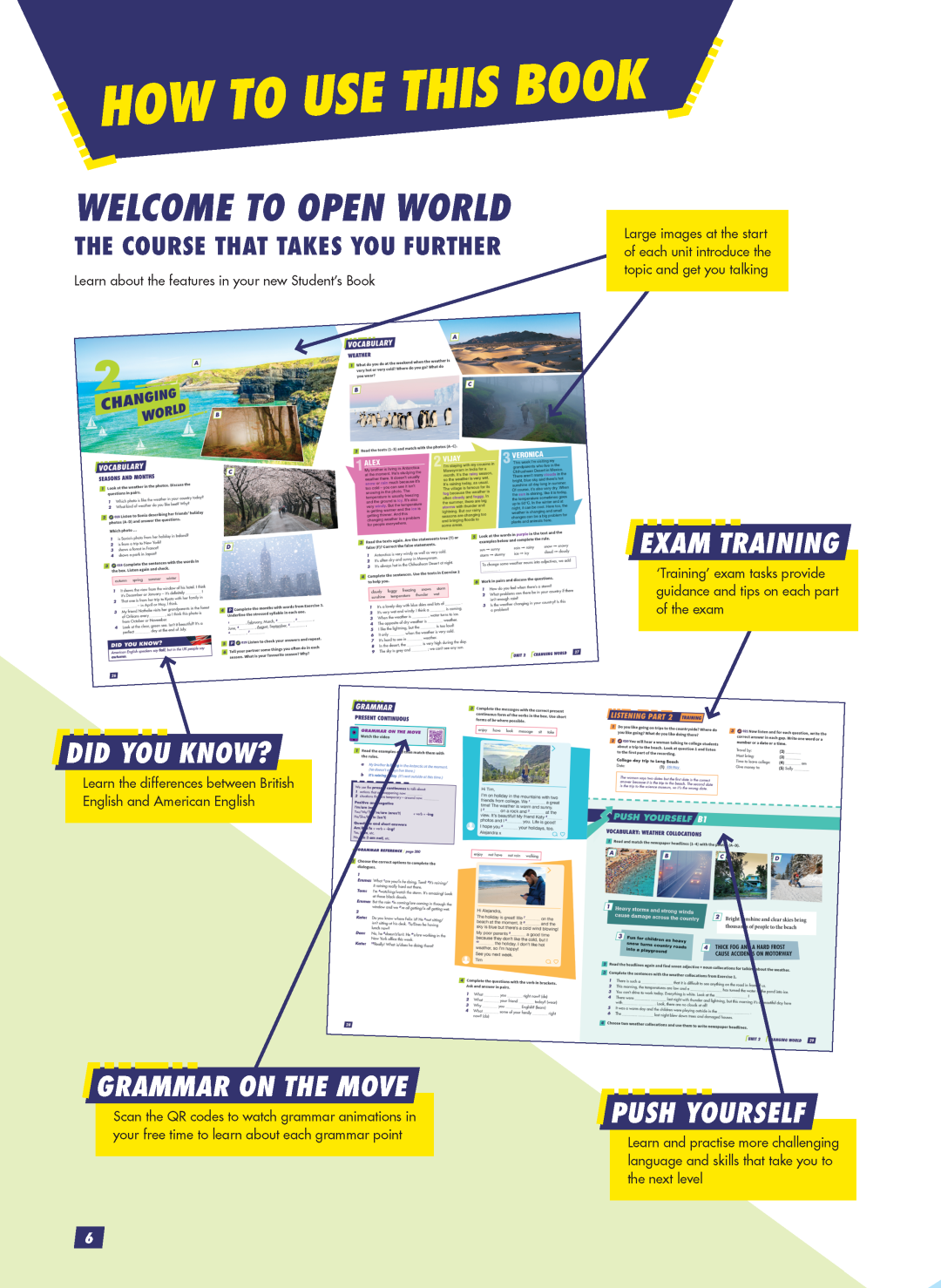 Vadovėlį sudaro 14 skyrių. Kiekvienas jų pradedamas įspūdingomis nuotraukomis, kuriose pristatoma pagrindinė skyriaus mintis, skatinančiomis diskusijas bei įžvalgas. Skiltyje „Did you know?“ pateikiamas paaiškinimas, kuo skiriasi tam tikrų žodžių vartojimas britiškojoje ir amerikietiškojoje anglų kalboje, kas skatina pažinti skirtingas kultūras. Gramatikos užduotys pateikiamos ir nuskaičius QR kodą („Grammar on the Move“), tad mokiniai gali mokytis gramatikos animacijos pagalba. Kiekviename skyriuje pateikiama iššūkius skatinančių („Push Yourself“) užduočių, kurios skatina ir motyvuoja mokinius gilinti turimas žinias, taip pat puikiai tinka ugdymosi turiniui pamokose diferencijuoti. „Exam Focus“ skiltyje mokiniams pateikiama patarimų, kaip tinkamai ir savivaldžiai mokytis ir ruoštis egzaminų užduotims. „Real World“ skiltyje skirtos vaizdo ir klausymo užduotys nukelia mokinius į atokiausius pasaulio kampelius ir perkelia mokymąsi iš klasės į realų pasaulį. „Life Competences“ skiltyje pateiktos užduotys puikiai tinka mediacijos, empatijos bei komunikacijos gebėjimams ugdyti. Kiekviename skyriuje pateikiama ir reflektavimo įgūdžius skatinančių užduočių bei klausimų. Vadovėlio medžiaga skatina mokinius įsitraukti į diskusijas, pateikiama naudingų patarimų tokiomis aktualiomis temomis: rūpinimasis savo gerove bei sveikata, kitų kultūrų pažinimas, mokymasis visą gyvenimą, finansinis raštingumas ir kt. Veiklos skatina savarankišką mąstymą ir kelia diskusijas.