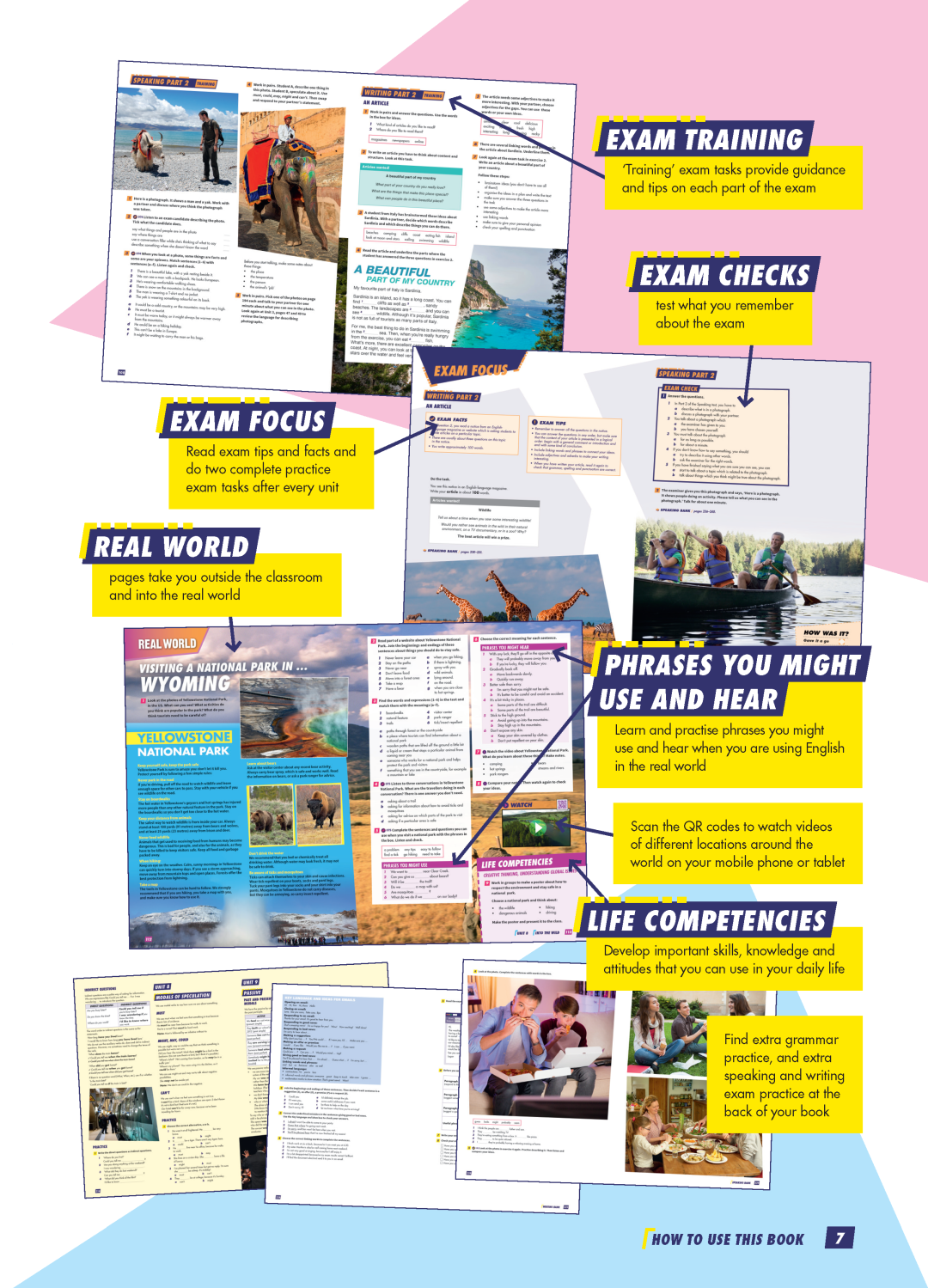 Vadovėlį sudaro 14 skyrių. Kiekvienas jų pradedamas įspūdingomis nuotraukomis, kuriose pristatoma pagrindinė skyriaus mintis, skatinančiomis diskusijas bei įžvalgas. Skiltyje „Did you know?“ pateikiamas paaiškinimas, kuo skiriasi tam tikrų žodžių vartojimas britiškojoje ir amerikietiškojoje anglų kalboje, kas skatina pažinti skirtingas kultūras. Gramatikos užduotys pateikiamos ir nuskaičius QR kodą („Grammar on the Move“), tad mokiniai gali mokytis gramatikos animacijos pagalba. Kiekviename skyriuje pateikiama iššūkius skatinančių („Push Yourself“) užduočių, kurios skatina ir motyvuoja mokinius gilinti turimas žinias, taip pat puikiai tinka ugdymosi turiniui pamokose diferencijuoti. „Exam Focus“ skiltyje mokiniams pateikiama patarimų, kaip tinkamai ir savivaldžiai mokytis ir ruoštis egzaminų užduotims. „Real World“ skiltyje skirtos vaizdo ir klausymo užduotys nukelia mokinius į atokiausius pasaulio kampelius ir perkelia mokymąsi iš klasės į realų pasaulį. „Life Competences“ skiltyje pateiktos užduotys puikiai tinka mediacijos, empatijos bei komunikacijos gebėjimams ugdyti. Kiekviename skyriuje pateikiama ir reflektavimo įgūdžius skatinančių užduočių bei klausimų. Vadovėlio medžiaga skatina mokinius įsitraukti į diskusijas, pateikiama naudingų patarimų tokiomis aktualiomis temomis: rūpinimasis savo gerove bei sveikata, kitų kultūrų pažinimas, mokymasis visą gyvenimą, finansinis raštingumas ir kt. Veiklos skatina savarankišką mąstymą ir kelia diskusijas.