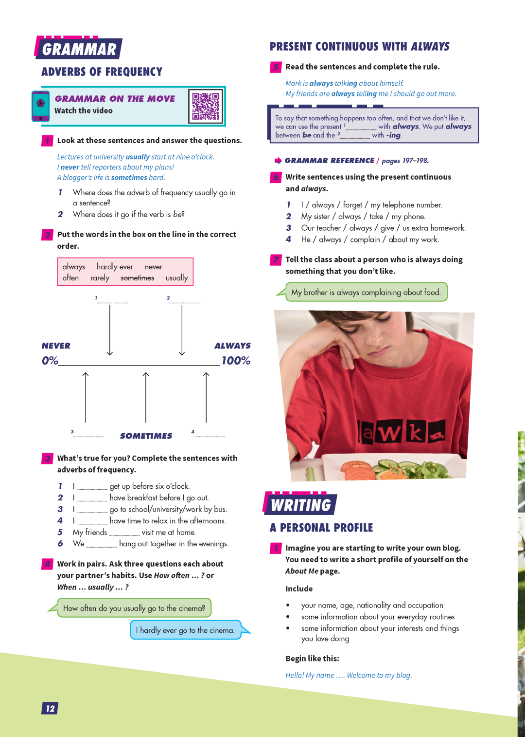 - gramatikos santraukų su paaiškinimais bei praktinėmis užduotimis, netaisyklingų veiksmažodžių lentelė, frazinių veiksmažodžių bankas su užduotimis, rašymo formų pavyzdžių bankas su užduotimis, kalbėjimo užduočių pavyzdžių su užduotimis, prisijungimo kodas prie „online“ užduočių.