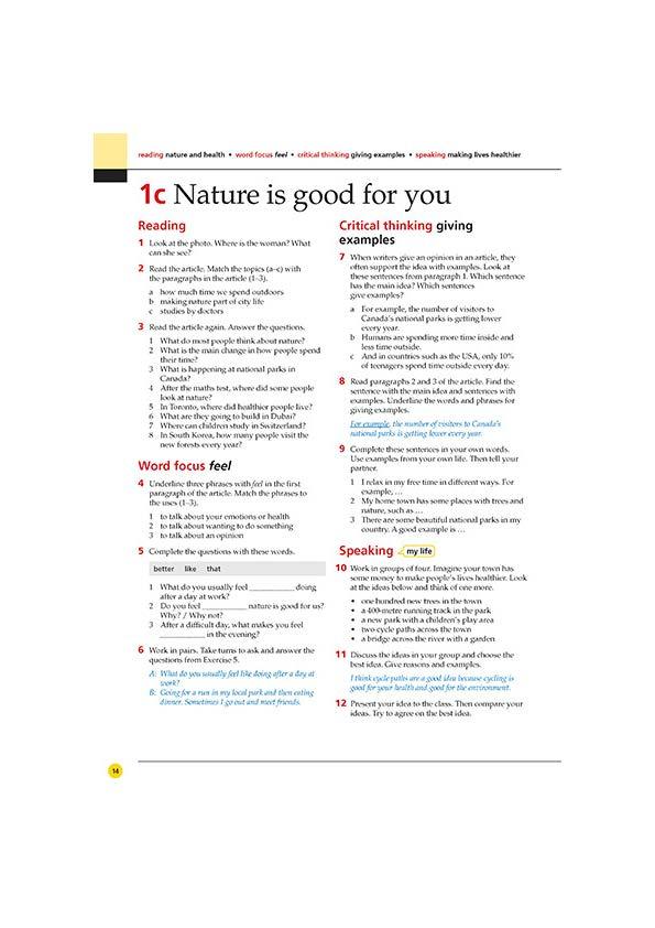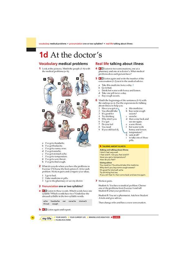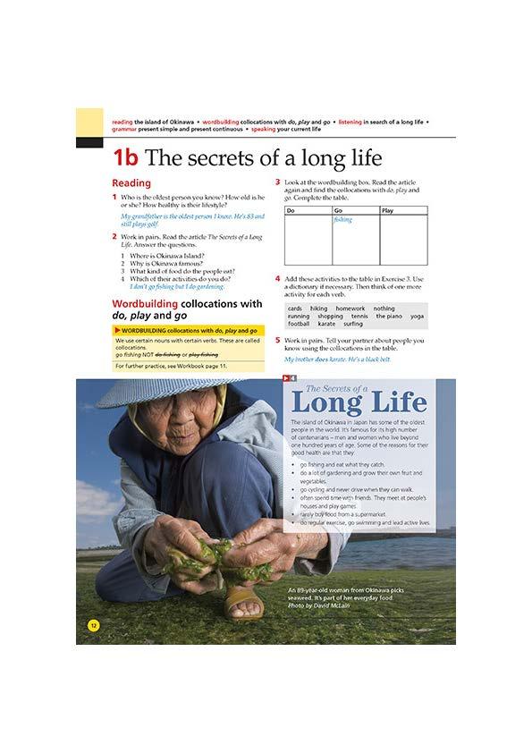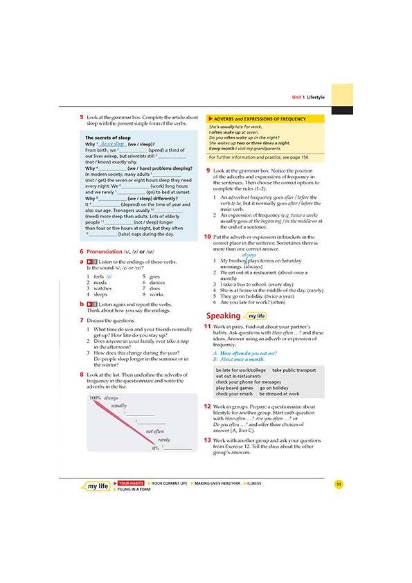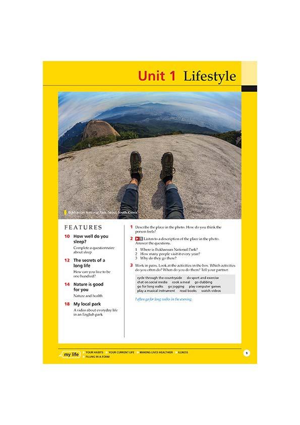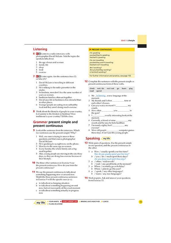 - Mokinio knyga: 12 skyrių, kiekvienas suskirstytas į skaitymo, žodyno, gramatikos, klausymo, rašymo, vaizdo įrašų žiūrėjimo užduočių poskyrius; gramatikos santraukos su visais paaiškinimais, netaisyklingų veiksmažodžių lentelė, rašymo formų pavyzdžių bankas, kalbėjimo užduočių pavyzdžiai ir posakiai, žodžių junginiai, prielinksniai, frazės ir posakiai su veiksmažodžiais.