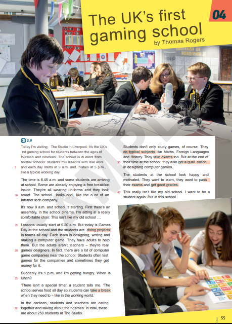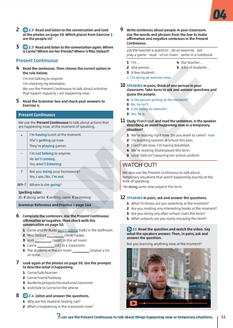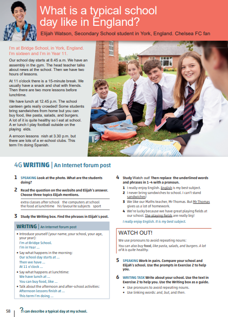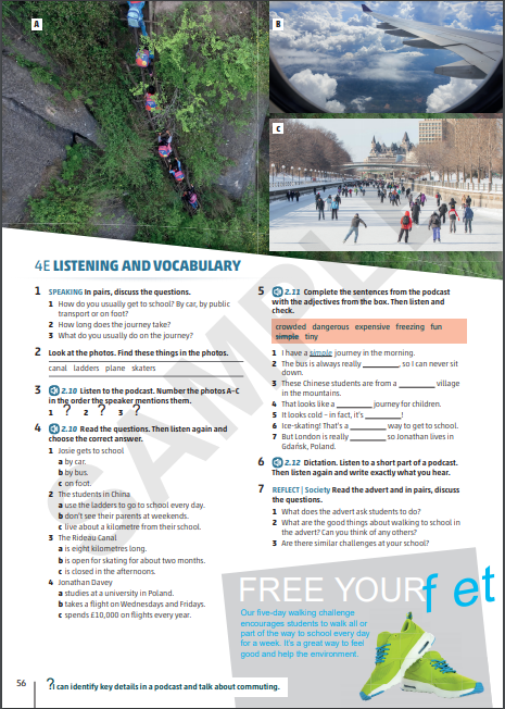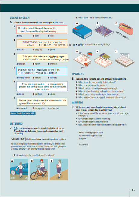 - Mokinio knyga – integruoti mokomosios medžiagos komplektai, gramatinės ir teorinės medžiagos sąvadas su pratimais. 10 praktinių skyrių apima kalbinius gebėjimus bei gramatines ir leksines žinias. Naujų žodžių bankas („Word list“) ir kartojimo („Revision“) atvartai pateikiami kiekvieno skyriaus pabaigoje. Vadovėlyje taip pat yra 5 gyvenimo įgūdžių („Life skills“) ugdymo atvartai. Vaizdo („Watch and reflect“) atvartuose, remiantis vaizdo medžiagos siužetais, pateikiamos kalbėjimo, žodyno plėtros ir rašymo užduotys. Gramatikos („Grammar Reference“) sąvade pateikiamos taisyklės, pavyzdžiai, pratimai. Kalbos vartojimo („Use of English“) medžiagos sąvade pateikiami įvairių užduočių tipų modeliai. Vadovėlyje taip pat pateikiamos kalbėjimo įskaitos pavyzdinės užduotys („Communication activities“).