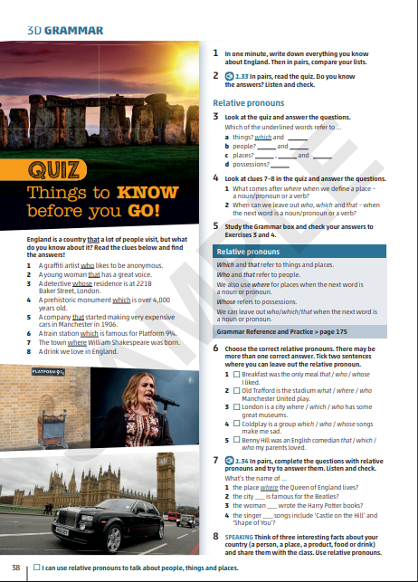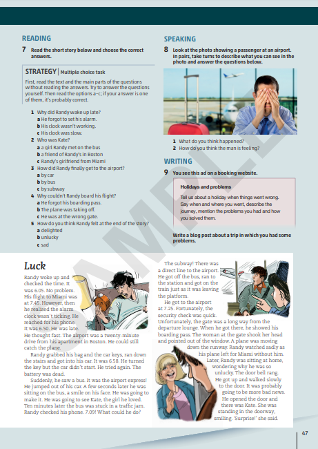 - Mokinio knyga – integruoti mokomosios medžiagos komplektai, gramatinės ir teorinės medžiagos sąvadas su pratimais. 10 praktinių skyrių apima kalbinius gebėjimus bei gramatines ir leksines žinias. Naujų žodžių bankas („Word list“) ir kartojimo („Revision“) atvartai pateikiami kiekvieno skyriaus pabaigoje. Vadovėlyje taip pat yra 5 gyvenimo įgūdžių („Life skills“) ugdymo atvartai. Vaizdo („Watch and reflect“) atvartuose, remiantis vaizdo medžiagos siužetais, pateikiamos kalbėjimo, žodyno plėtros ir rašymo užduotys. Gramatikos („Grammar Reference“) sąvade pateikiamos taisyklės, pavyzdžiai, pratimai. Kalbos vartojimo („Use of English“) medžiagos sąvade pateikiami įvairių užduočių tipų modeliai. Vadovėlyje taip pat pateikiamos kalbėjimo įskaitos pavyzdinės užduotys („Communication activities“).