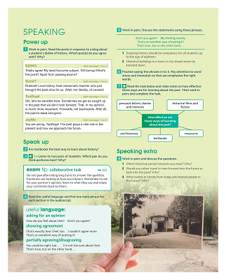 - Mokinio knyga – integruoti mokomosios medžiagos komplektai, pažangos testai, teorinės medžiagos sąvadas su pratimais bei egzamino laikymo strategijų gairės. 10 praktinių skyrių apima kalbinius gebėjimus bei gramatines ir leksines žinias. Testai padeda išbandyti tipines B1 lygio egzaminų užduotis. Gramatikos sąvade pateikiamos taisyklės, pavyzdžiai, atkreipiamas dėmesys į būdingiausias mokinių klaidas. Rašymo medžiagos sąvade pateikiami įvairių tekstų tipų modeliai, rašytinio teksto vertinimo kriterijai bei mokinių atsakymų pavyzdžiai su komentarais. Vadovėlyje taip pat pateikiamos kalbėjimo įskaitos pavyzdinės užduotys.
